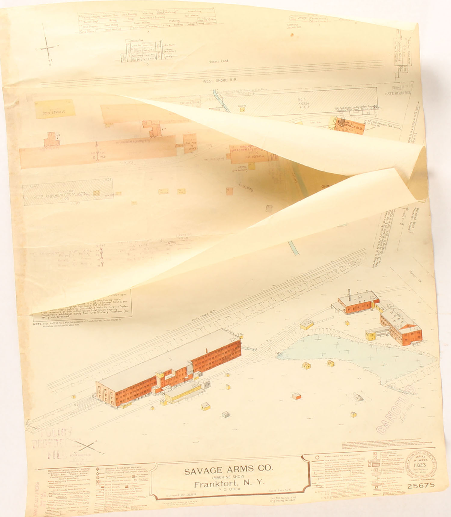 Savage Arms Co. Machine Shop Blueprints, Frankfort, NY, dated 1915, multi-color prints, with an attached sheet with changes or updates to the plans, some light age soiling & staining around the edges. Grade: Very Good - Value: 20 to 100
