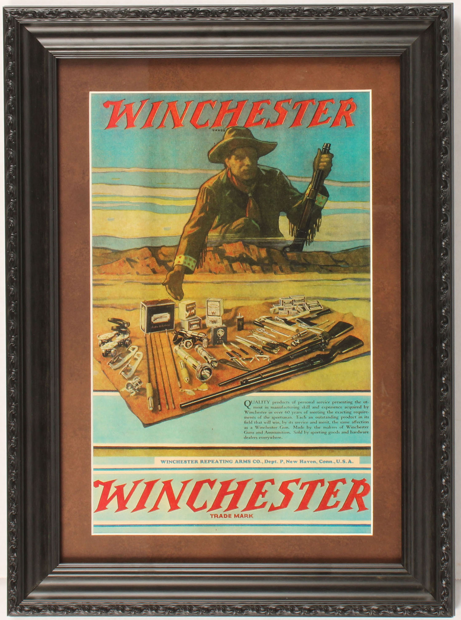 Winchester Poster, photocopy of original, pictures a full color image of a salesman with a table full of Winchester products with a desert backdrop, nicely framed, no visible wear or damage, 9 1/2'' x 15''. Grade: Excellent - Value: 30 to 100