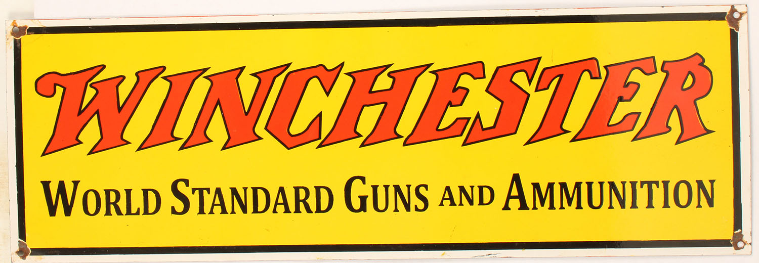 LARGE Winchester Porcelain Metal Sign, ''WORLD STANDARD GUNS AND AMMUNITION'', one sided, yellow/red/black/white sign, black back, excellent colors, some minor edge wear & loss around the hanging holes, otherwise excellent, Circa 2000. 36'' x 12''. Grade: Excellent - Value: 250 to 500