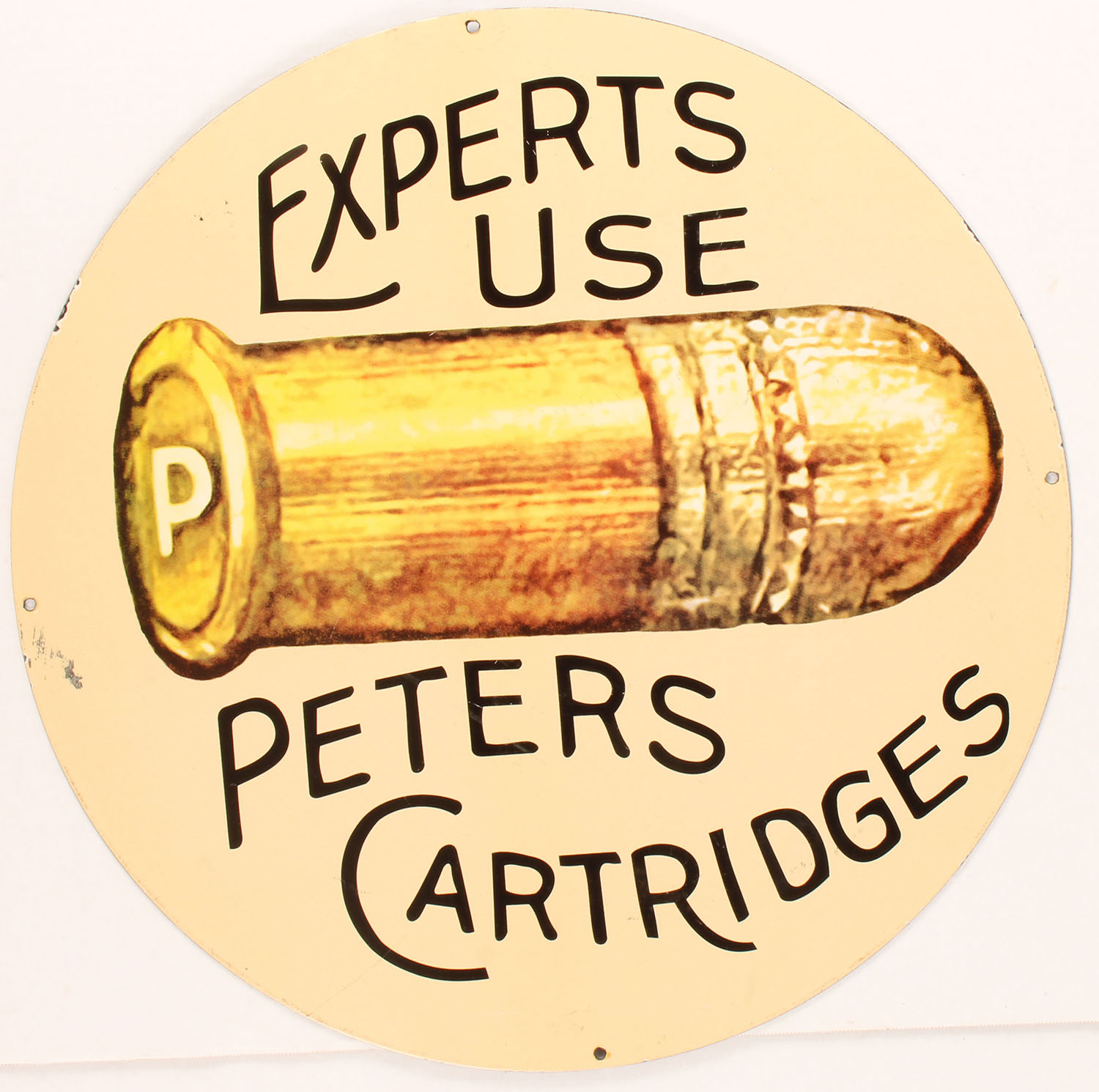 Large Peters Cartridges Porcelain Metal Store Sign, ''EXPERTS USE PETERS CARTRIDGES'', features a Peters rimfire cartridge in the center, single sided, cream/gold/black, black back, great colors, minor scuffs around the edges, otherwise excellent, Circa 2000, 24'' x 24''. Grade: Excellent - Value: 250 to 500