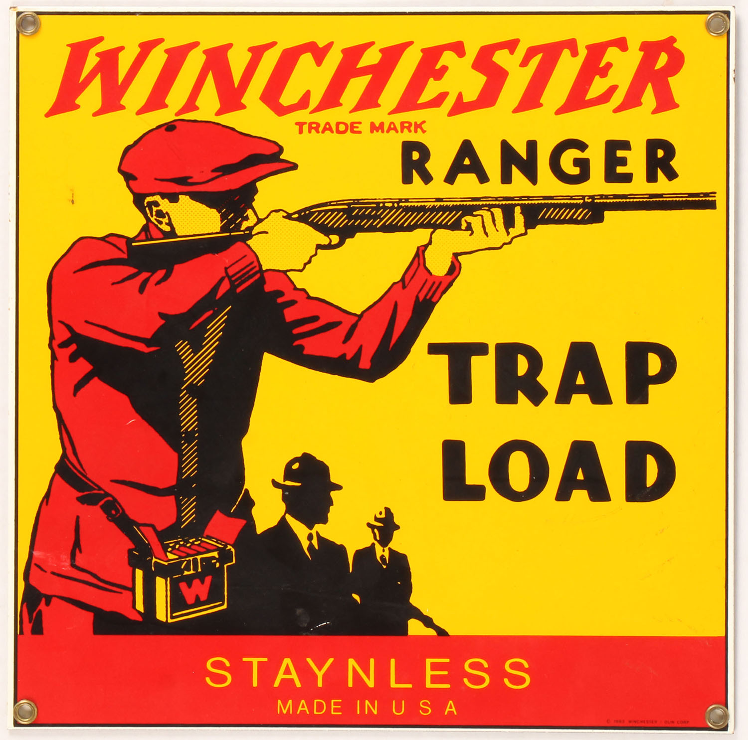 Winchester Ranger Porcelain Metal Sign, ''RANGER TRAP LOAD'', dated 1993, multi-color sign, one sided, metal gray back, has image of shooter & onlookers, great colors, brass eyelet hangers, some light scuffs, Circa 2000, 10'' x 10''. Grade: Excellent - Value: 100 to 200