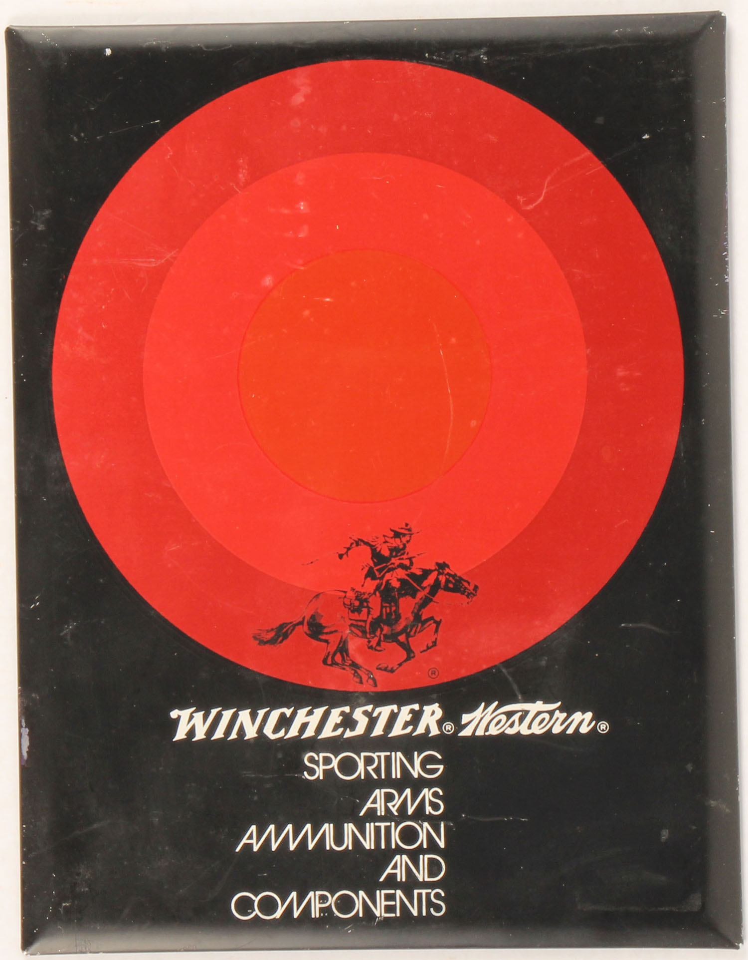 Winchester-Western Sporting Arms Ammunition and Components Tin Metal Wall/Counter Display, light wear throughout with scuffs & scrapes, 8 1/2''x11''Grade: Very Good++ - Value: 40 to 100