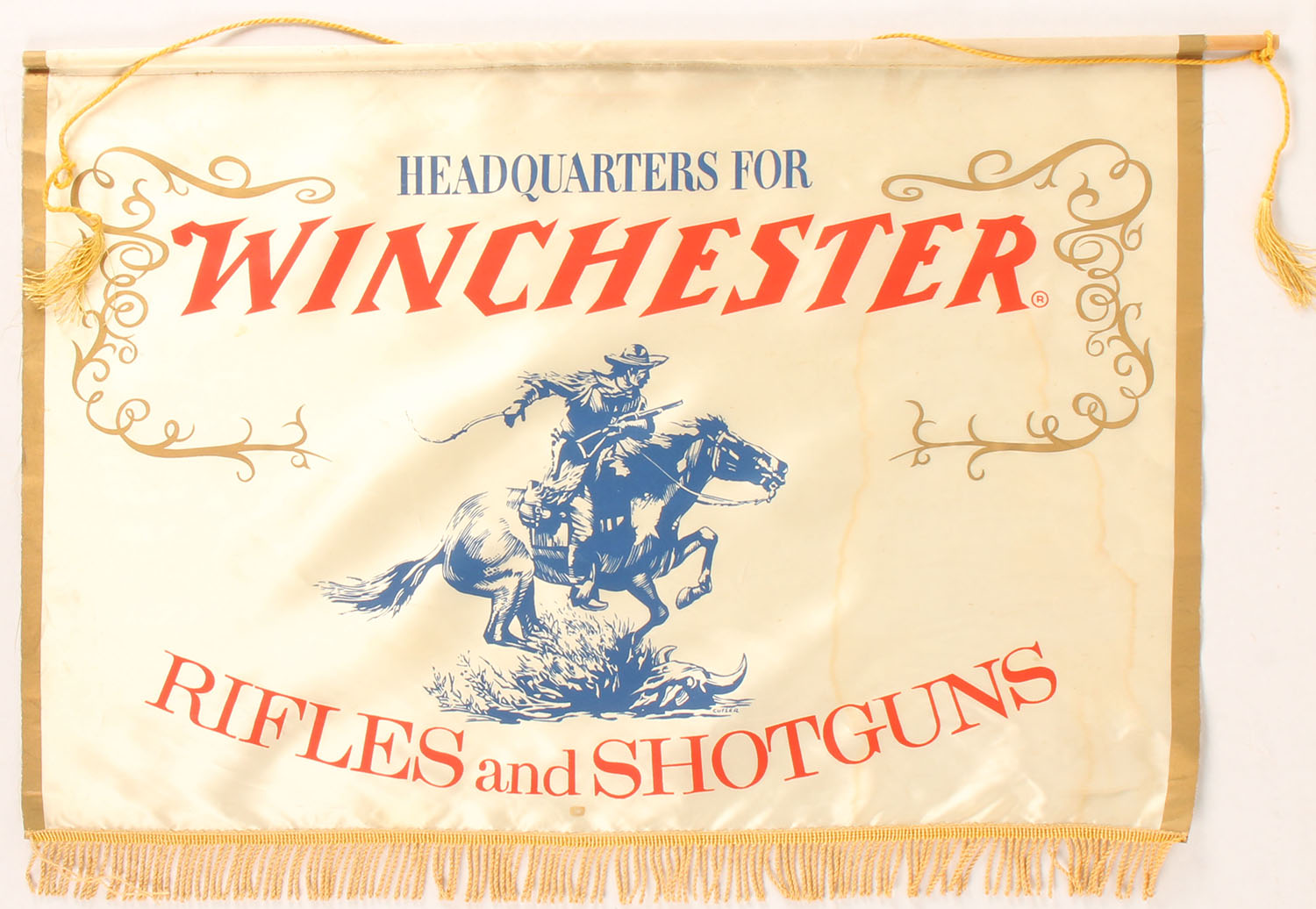 Winchester Banner ''HEADQUARTERS FOR WINCHESTER RIFLES AND SHOTGUNS'', white/gold/red/blue, one sided, some age soiling & light staining. Grade: Very Good - Value: 30 to 90
