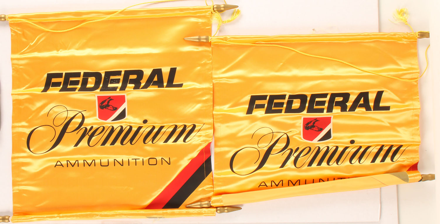 Lot of 2 Federal Banners, ''FEDERAL PREMIUM AMMUNITION'', gold, red & black, 20'' x 23''. Grade: Excellent - Value: 40 to 60