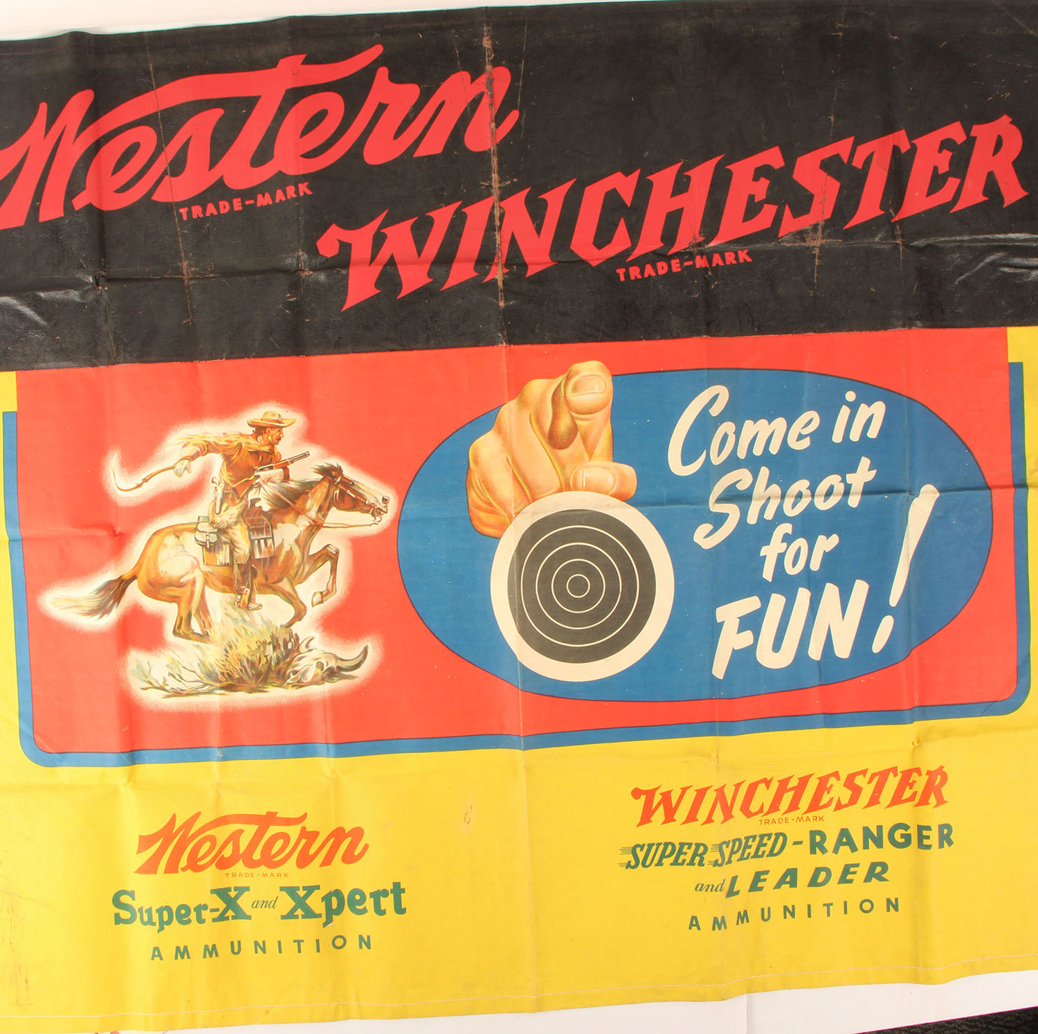 Winchester - Western Canvas Banner, ''COME IN SHOOT FOR FUN'', pictures a target with a finger pointed towards you, Winchester logo, Western Super -X & Xpert Ammo logo & Winchester SuperSpeed Ranger & Leader Ammo logo. Some cracking to the black part of the banner, one sided, some age soiling & staining. 56'' x 49'' Grade: Good++ - Value: 50 to 150
