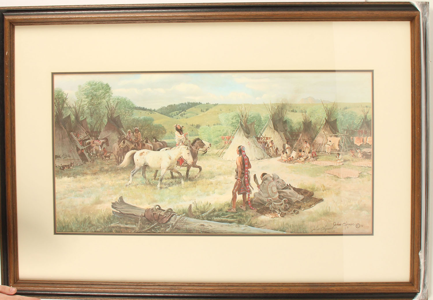 John Clymer, Indians Series ''SIOUX CAMP'', Print #402/750, 1972, pictures the Sioux Indian Tribe in their camp, wonderful image & colors, double wood framed, 42'' x 29'' w/frame, comes with a certificate of authenticity and a bio on the artists. Grade: MINT - Value: 200 to 600