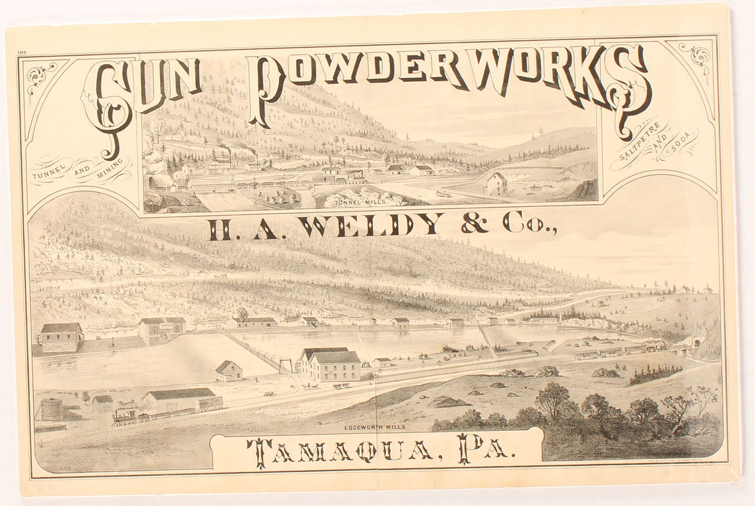 Gun Powder Works, H.A Weld & Co., Tamaqua, PA, print, pictures Tunnel Mills & Edgeworth Mills, wrapped to foam board with plastic shrink wrap, has 5'' tear bottom center along the folding crease, 24'' x 16''. Grade: Very Good - Value: 10 to 50