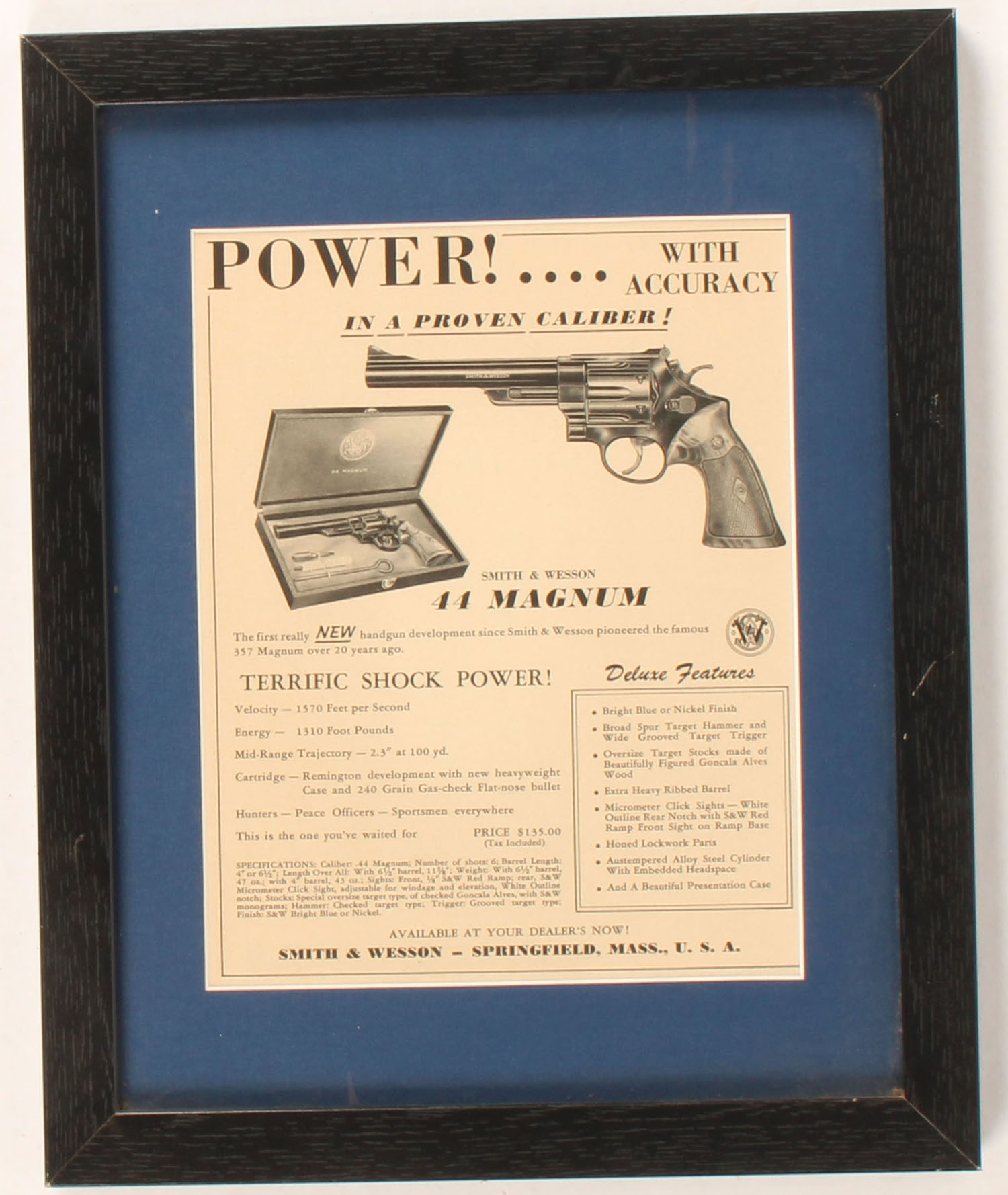 Smith & Wesson Ad for 44 Magnum, lists specs, features, framed, 16'' x 12 1/2'' w/frame. Grade: Excellent - Value: 10 to 50