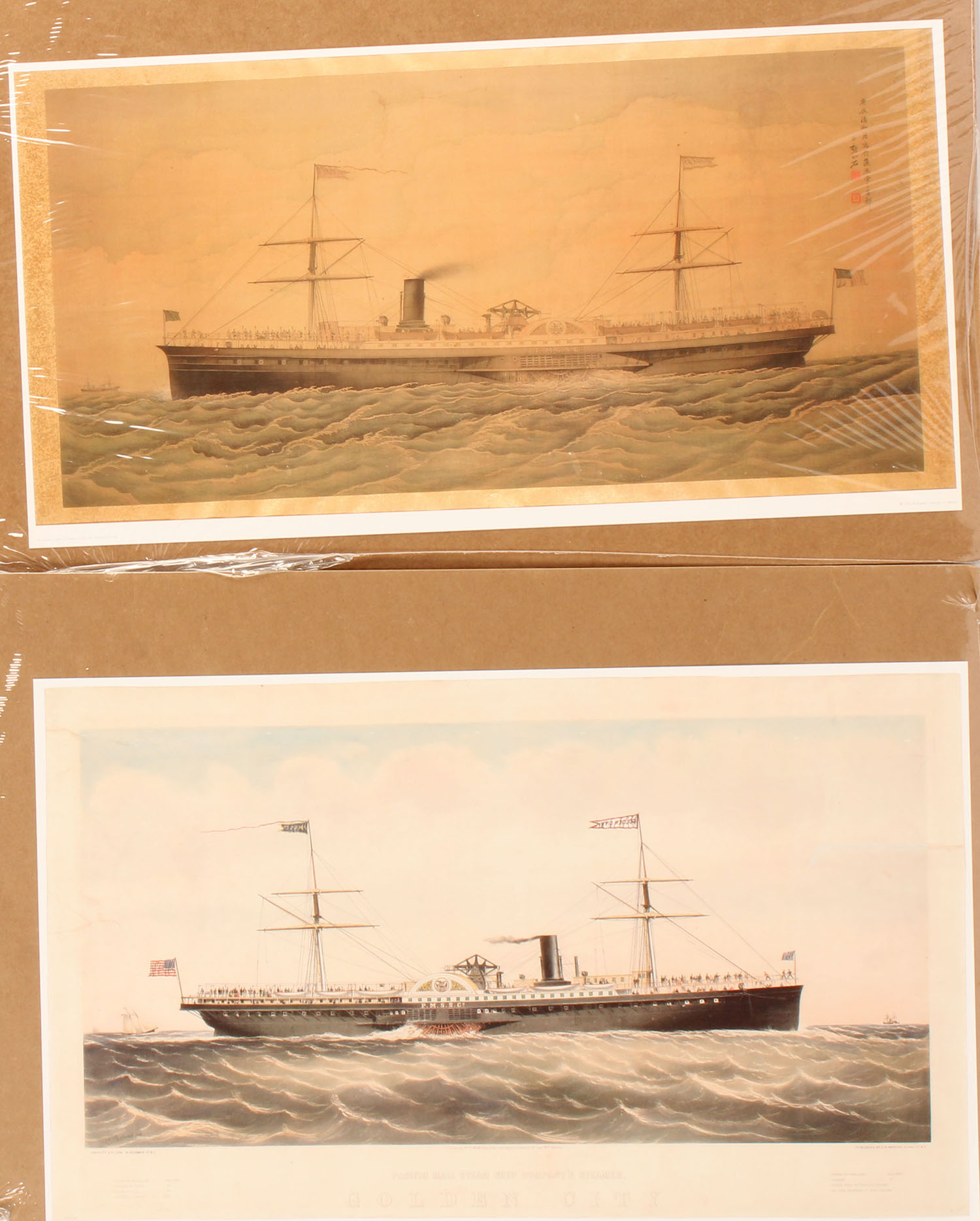 Lot of 2 : Pacific Mail Steam Ship Company Steamer prints, one is more monotone, one is in full color, similar images, but vary slightly, images sizes are 16 1/2'' x 10'' (color) & 16 1/2'' x 8 1/2'' (monotone), both pieces are shrink wrapped to cardboard. Grade: Excellent - Value: 10 to 50