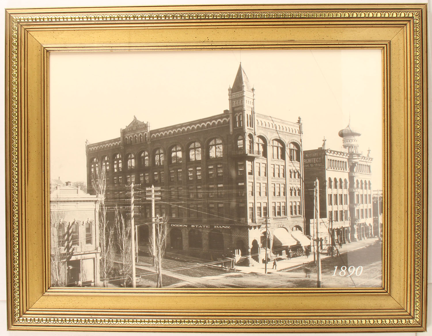 JOHN BROWNING Store. Large print of 1890 B&W photograph of the corner of Washington Avenue & 25th street Ogden, UT. On the corner is the Reed hotel, which later became the Bigalow Hotel & then the Ben Lomond Hotel for decades. Of significance is the small building to the south of the hotel, which is one of the original shop/store locations of famous gun inventor John Browning. Today, a monument resides next to the hotel honoring John Browning in the location where this building once resided. The 29'' x 21'' image is nicely framed. A fine collectible for the John Browing fan or collector of Browning firearms. Grade: Excellent - Value: 50 to 150