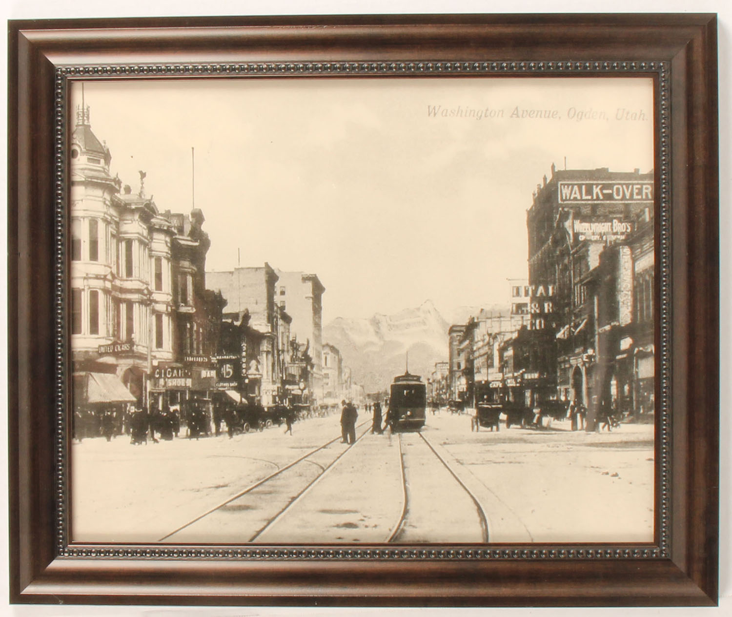 Large print of Antique B&W photograph of Washington Avenue, Ogden, UT. This was the major hub of business & daily life. Image includes the city's trolley, with the mountain of North Ogden in the background. The trolley ran in ogden from 1880 thru 1910. Washington Avenue was one of the store locations for famed firearms inventor John Browning. Nicely framed. The size including frame 24'' x 20''. Grade: Excellent - Value: 25 to 100