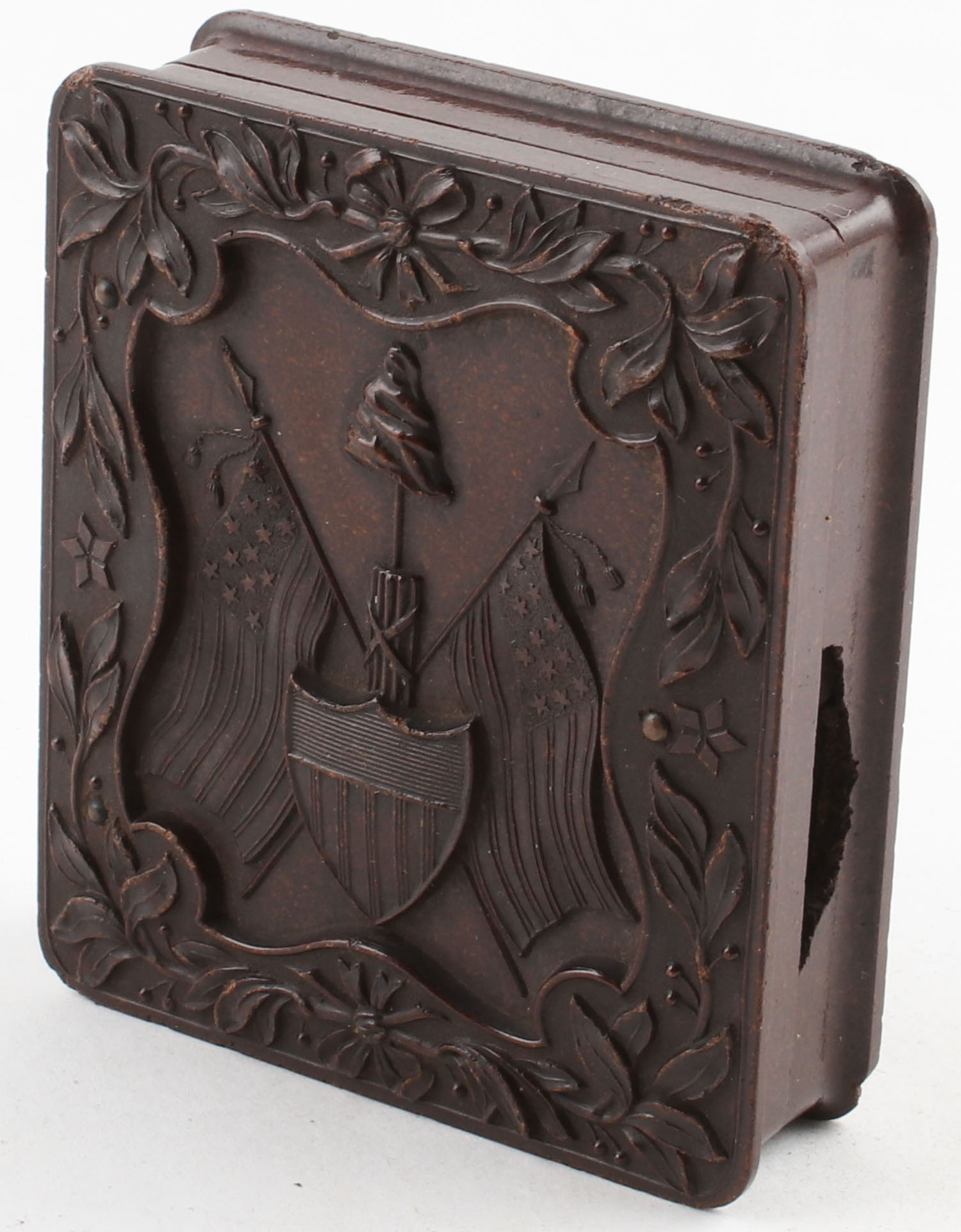 Antique Civil War Thermoplastic Photo Case. These cases were popular particularly before & during the Civil War. They held early forms of photography like daguerreotypes, ambrotypes & tintypes. The cases were made of a mix of shellac & wood fiber. They were also known as Union Cases (named for the ''union'' of the two materials). The material was developed circa 1850 & could be heated & pressed into moulds. Small chip next to latch, otherwise in great condition. 3'' x 2 1/2'' . These are fairly scarce & desirable by Civil War era collectors. Grade: Good ++ - Value: 100 to 300