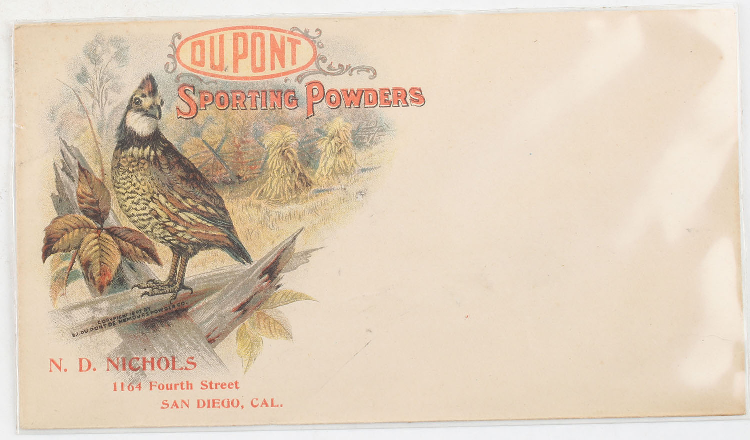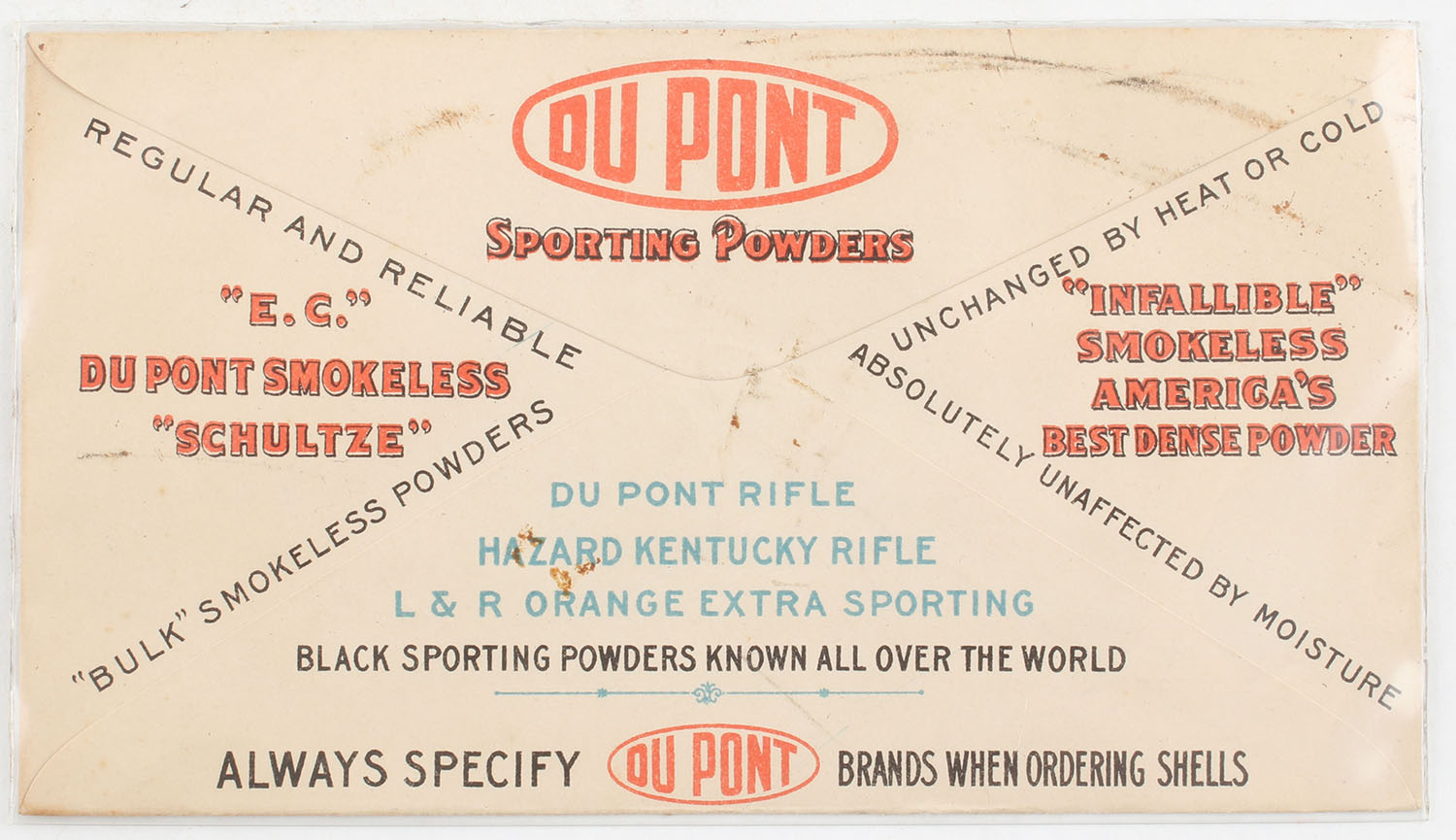 Du Pont Envelope, ''SPORTING POWDERS'', pictures a full color image of a perched bird & red text, the back is decorated in red, black & blue text, some staining on back & light age soiling overall. Grade: Very Good++ - Value: 40 to 120