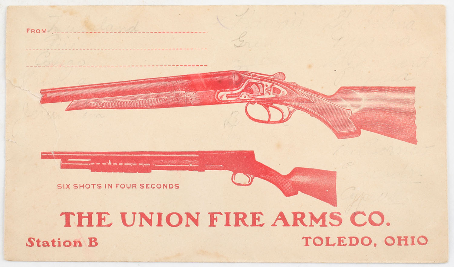 The Union Firearms Co. Envelope, ''SIX SHOTS IN FOUR SECONDS'', pictures a red double barrel & pump action, pencil writing on the front, faded but visible, light age soiling & small tear to left side, blank back. Grade: Good ++ - Value: 30 to 90