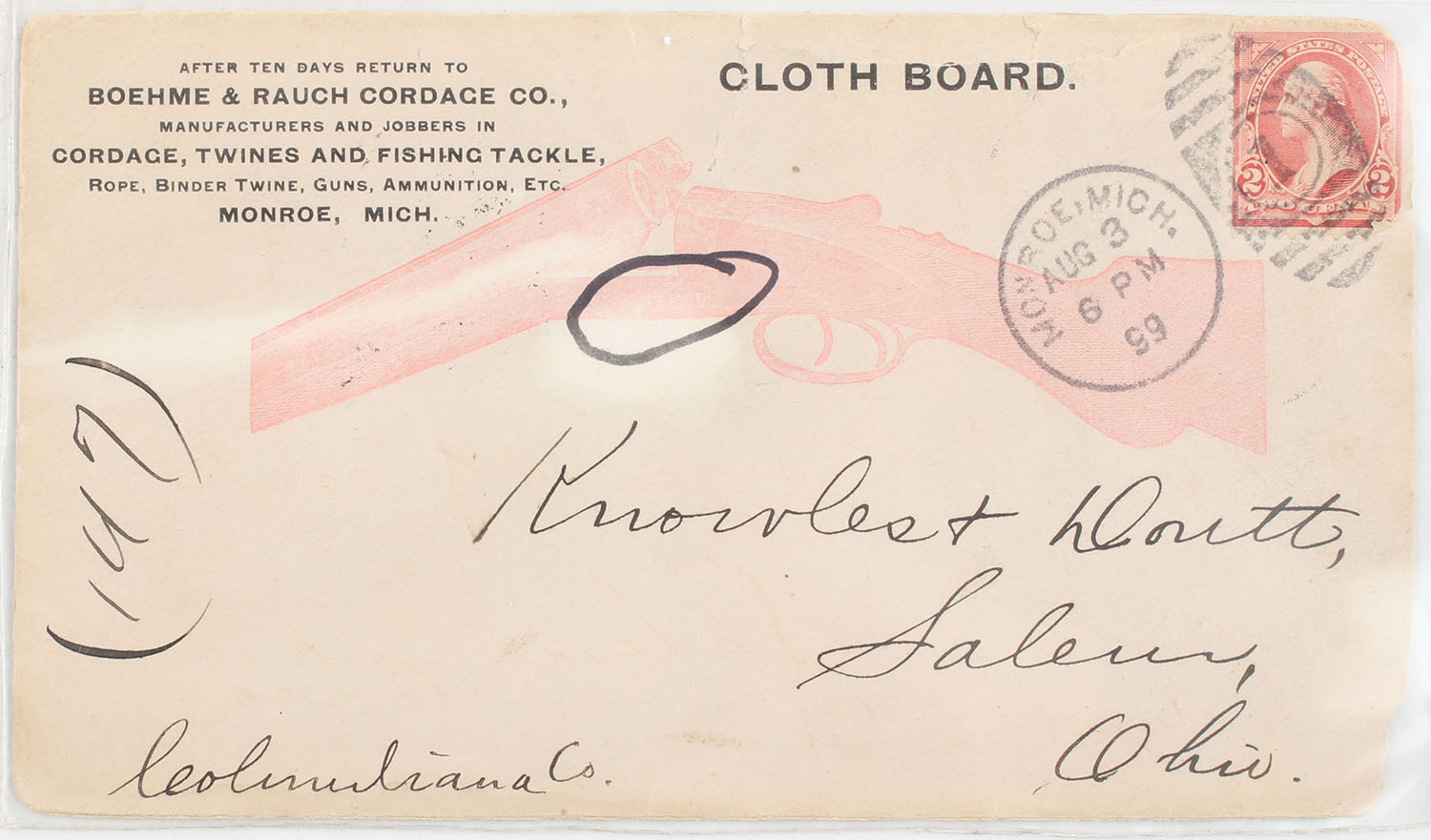 Boehme & Rauch Cordage Co. Envelope, ''CLOTH BOARD'', pictures a red image of a break action SxS shotgun, dated 1899, writing in pen & date stamp on the front/back, edges on the right corners are slightly rounded, light age soiling & a few small tears on the top edge. Grade: Good - Value: 20 to 80