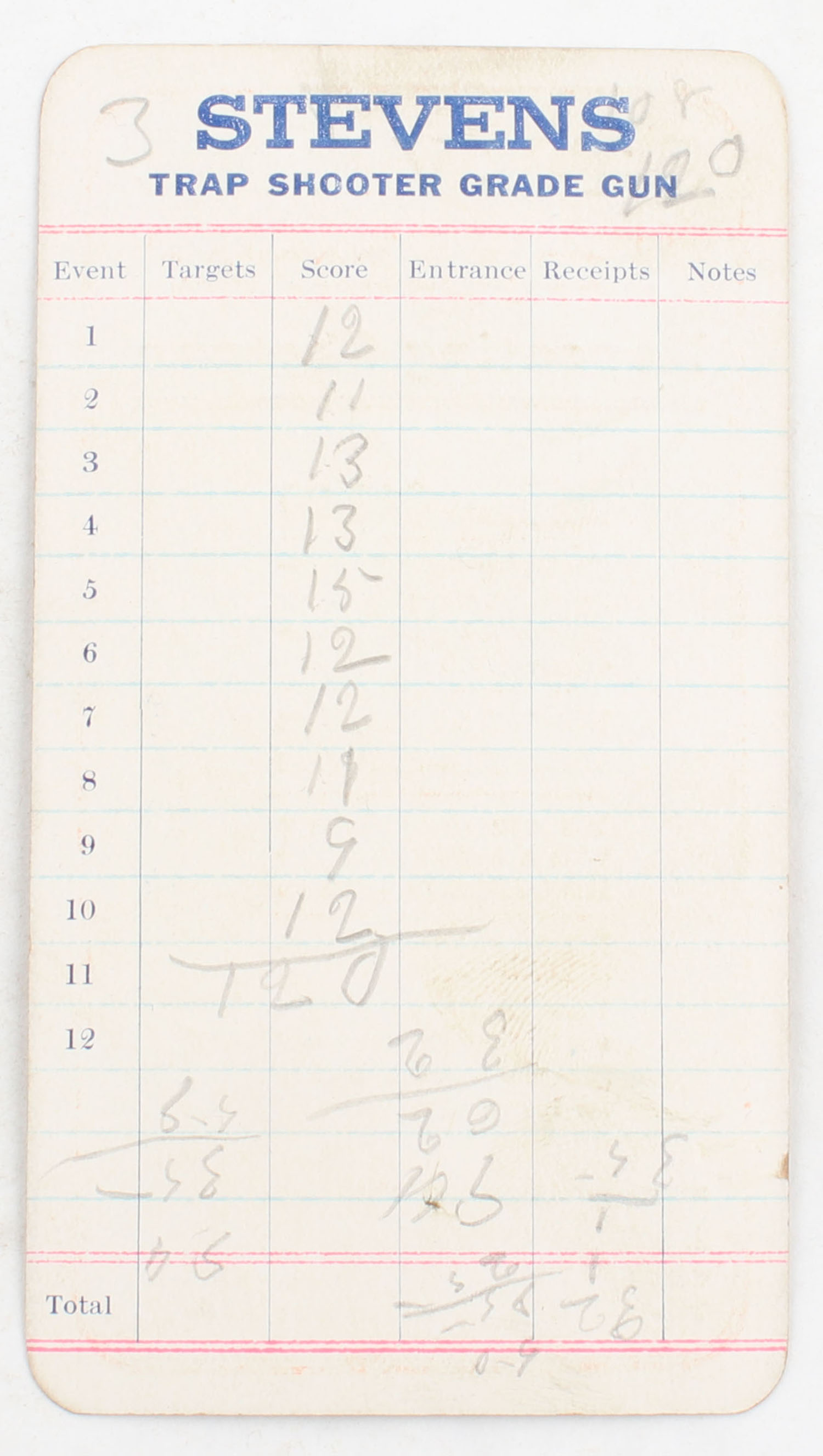 J Stevens Arms & Tool Co. Stevens ''TRAP SHOOTER'' Score Card, has info on front & scorecard on back, light age soiling, pencil writing on back . Grade: Very Good - Value: 10 to 50
