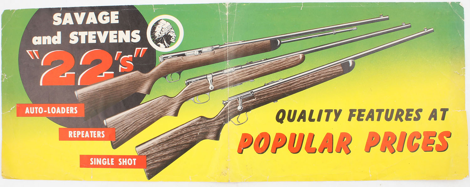 Savage and Stevens 22's Poster, ''AUTO- LOADERS REPEATERS SINGLE SHOT'', multi-color poster, rips & tears around the edges & wear at the middle crease. Grade: Good - Value: 10 to 50