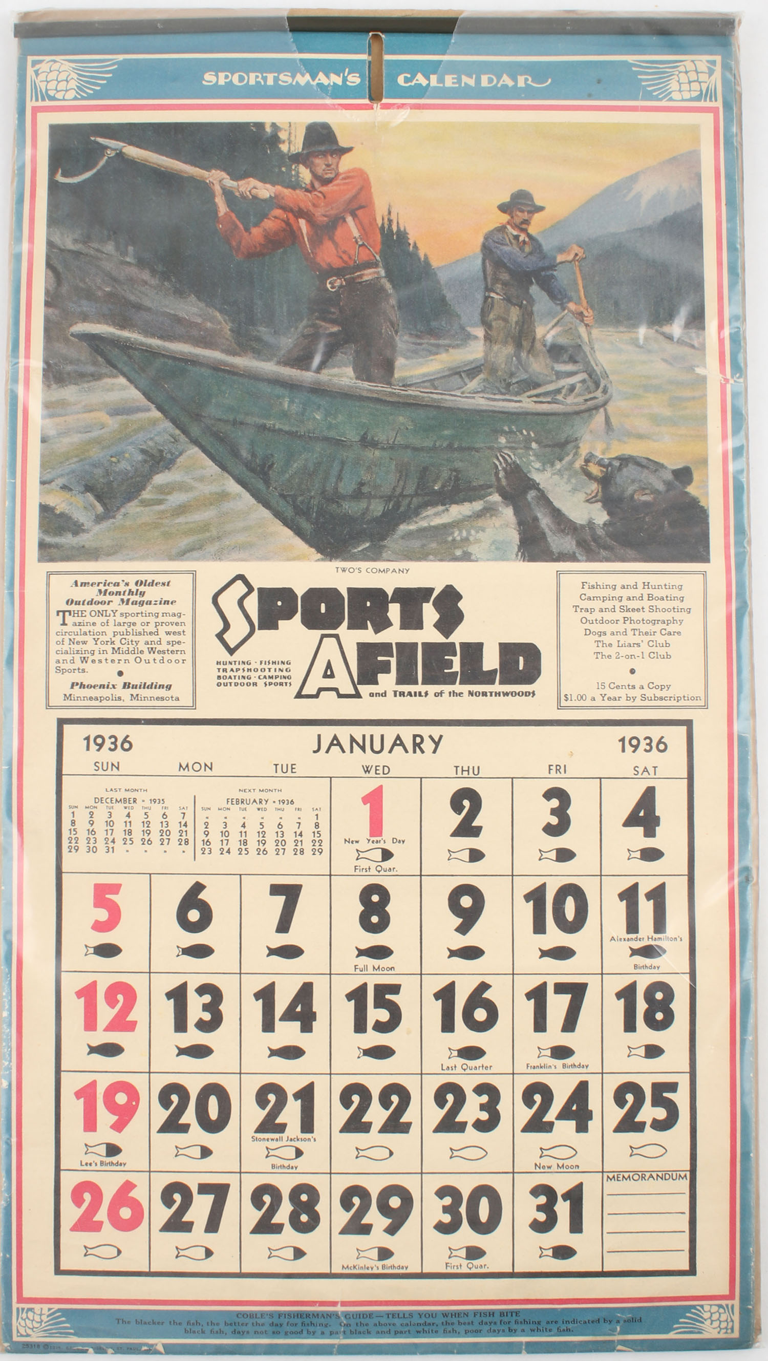 Sports Afield Sportsman Calendar, 1936, full calendar, some light edge wear. Grade: Excellent - Value: 20 to 80