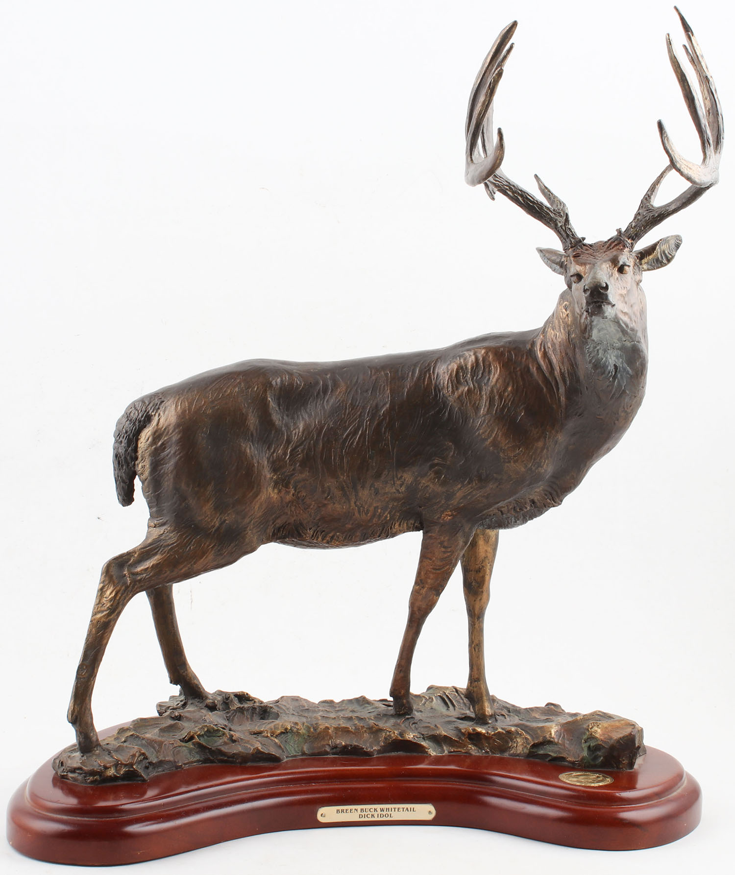 NWFT ''BREEN BUCK WHITETAIL'' Bronze Statue by Dick Idol, hollow bronze, 19'' tall x 16'' wide, wood base. Grade: Excellent - Value: 400 to 800