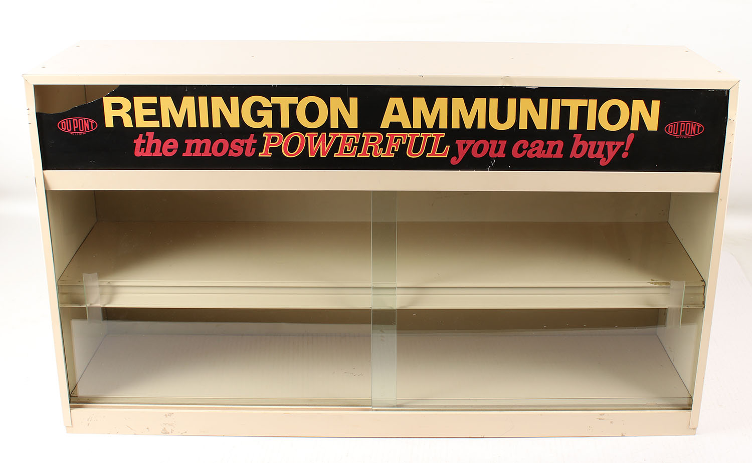 RARE! Large metal and glass Remington display case, ''the most POWERFUL you can buy!'', 36 x 11 x 21, very nice case with some handling marks, top left corner has a piece broken off but still present and can be repaired. Grade: Excellent - Value: 200 to 400
