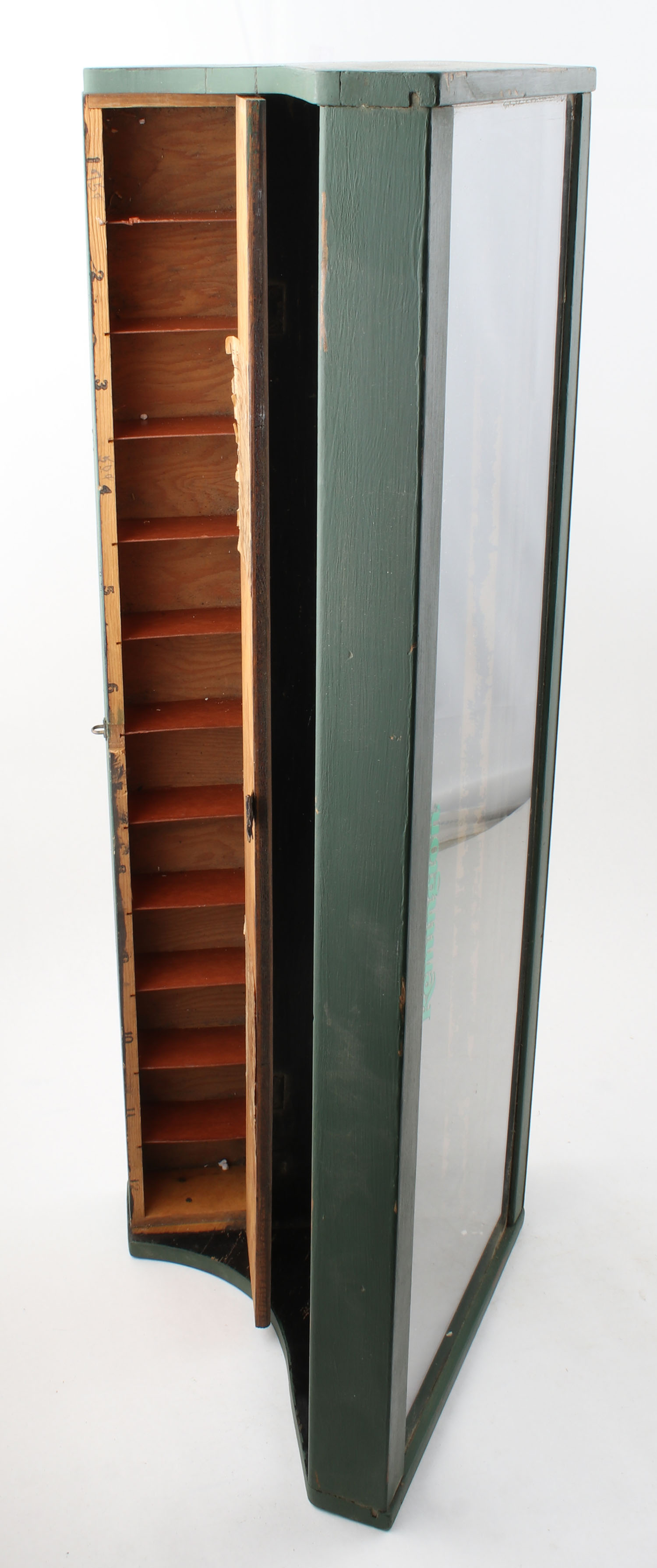 Remington wood and glass display case, has compartment with latch, 10.5'' x 29'' x 12'', Has replaced glass & green paint exterior is a repaint. Missing the knife mounting board behind the glass. Some scuffing to paint but all solid. Grade: Very Good ++ - Value: 100 to 400