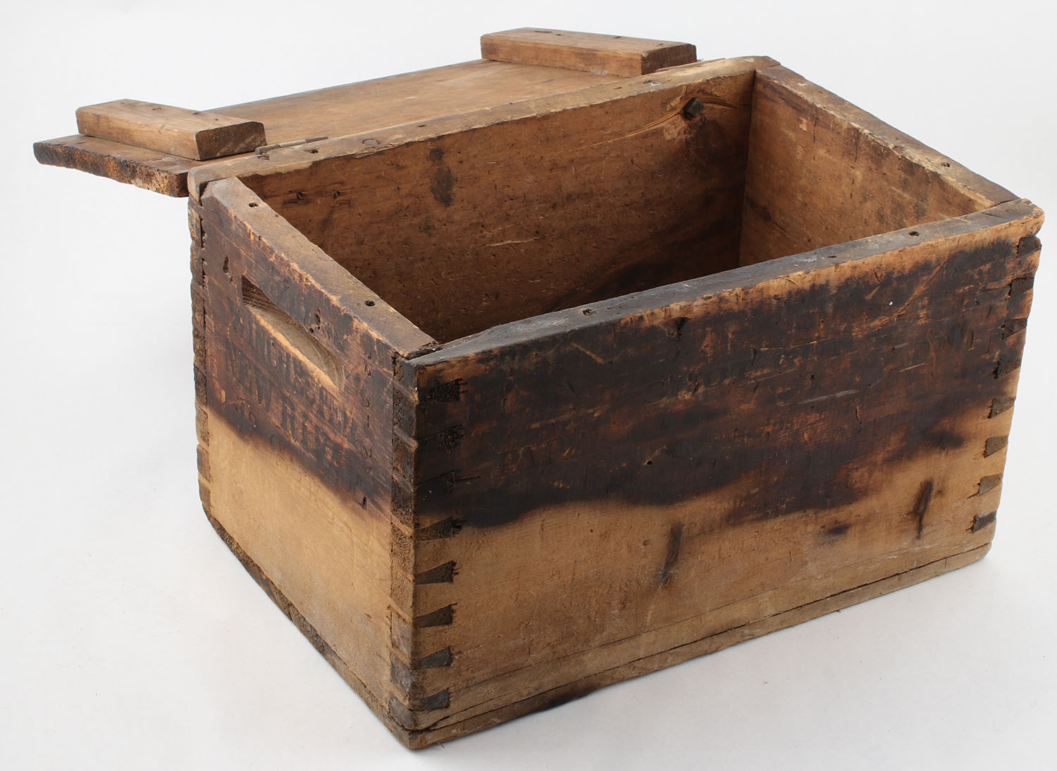 Winchester NEW RIVAL wood crate, 12 ga, black print is fading and crate has age soiling wit orignal lid with hinges. Grade: Very Good - Value: 20 to 50