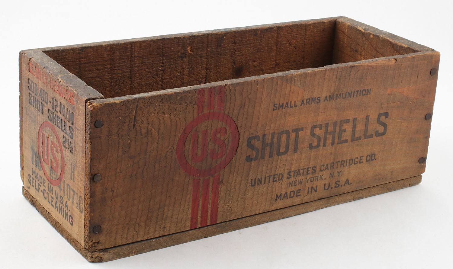 US .410 12 m/m wood crate, 7 1/2 chilled shot, black and red print is solid and crate has age soiling with scuffing. Grade: Very Good ++ - Value: 50 to 200