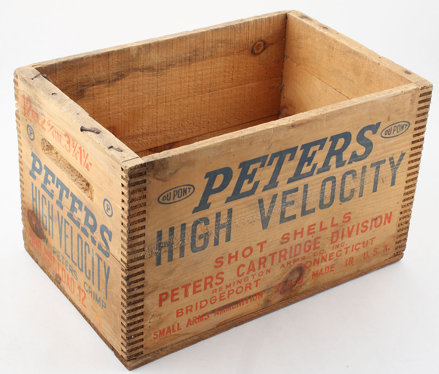 Peters High Velocity 12 ga wood crate, 4 shot, blue and orange print is solid and crate is bright and clean. Grade: Excellent - Value: 20 to 40
