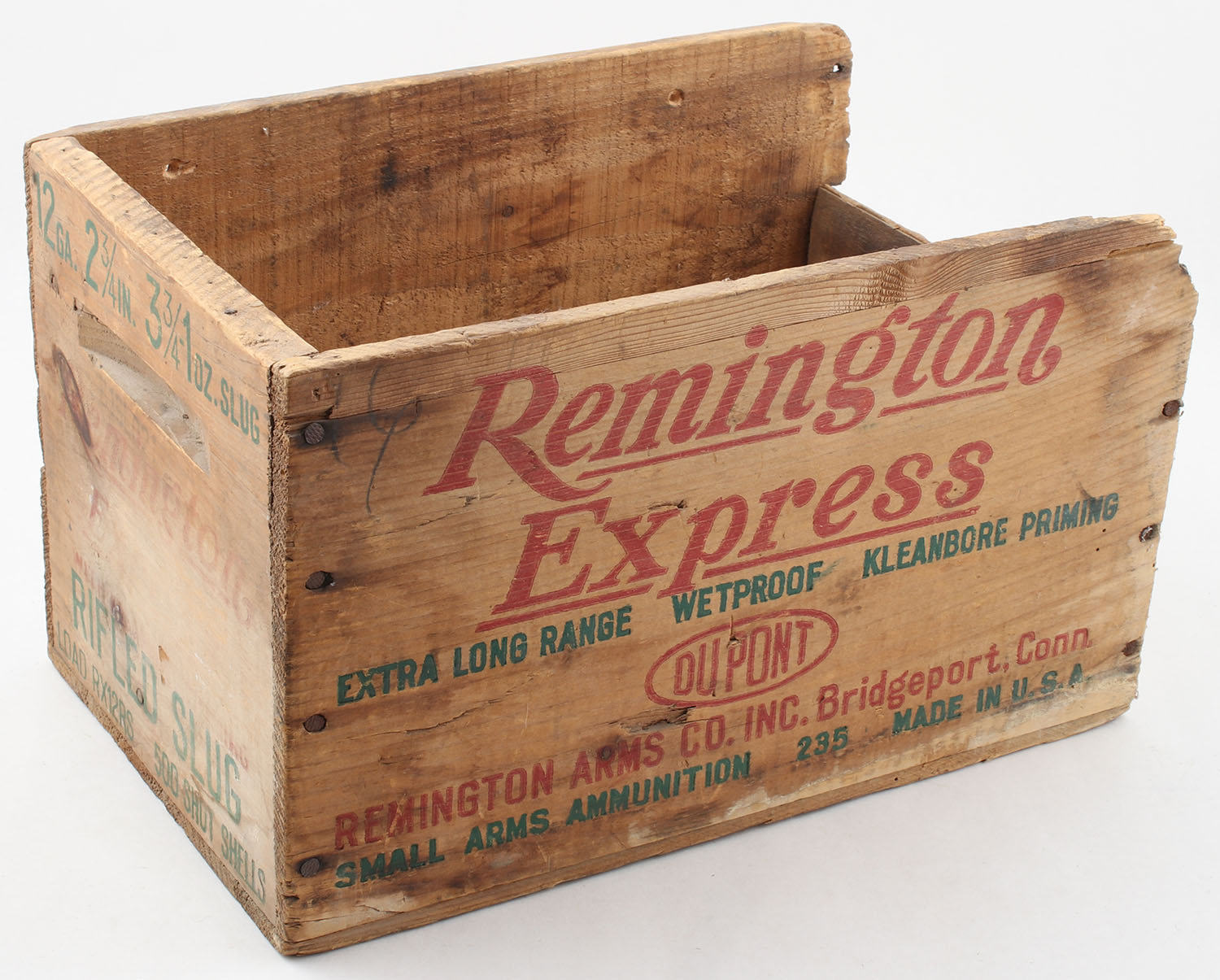 Remington, 12 Ga., Rifled Slugs, Express, red, & green print has fading and crate has one large piece missing on one end. Grade: Very Good - Value: 10 to 20