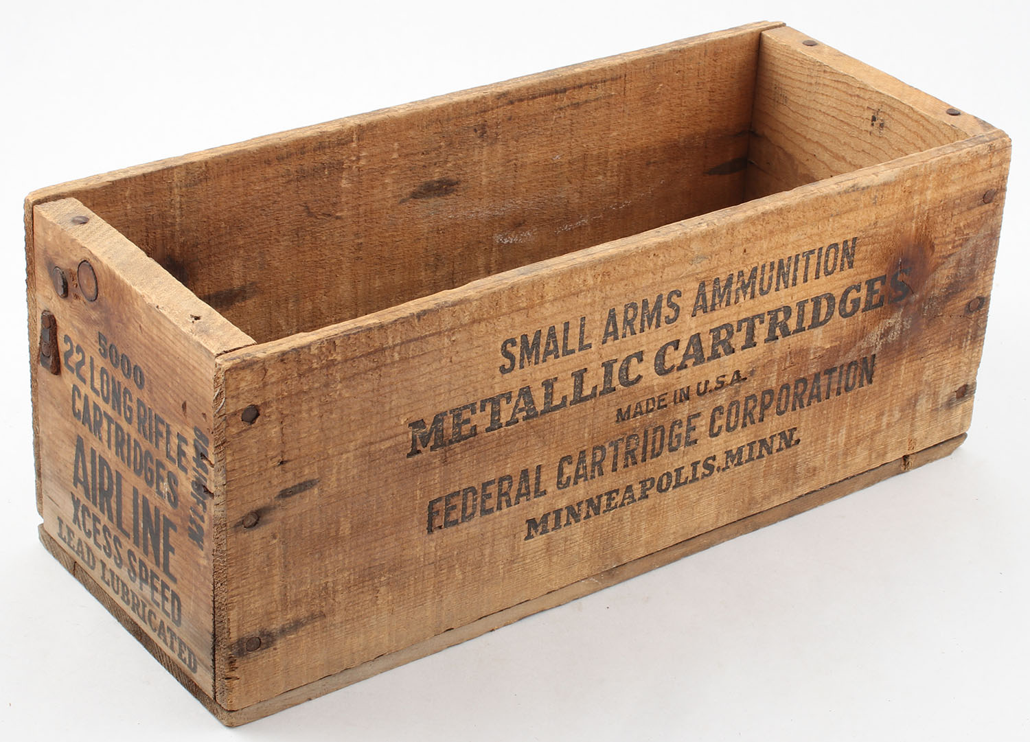 Federal Airline Xcess Speed .22 Long Rifle wood crate, black print is solid and crate is solid . Grade: Very Good ++ - Value: 10 to 50