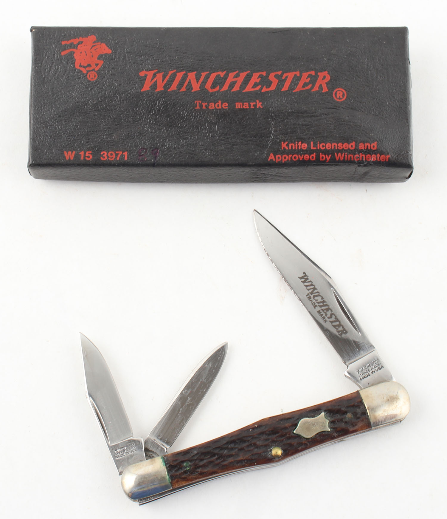 Winchester knife in orignal box, multi blade, 3971 '89, stag handles. Grade: Excellent - Value: 20 to 100