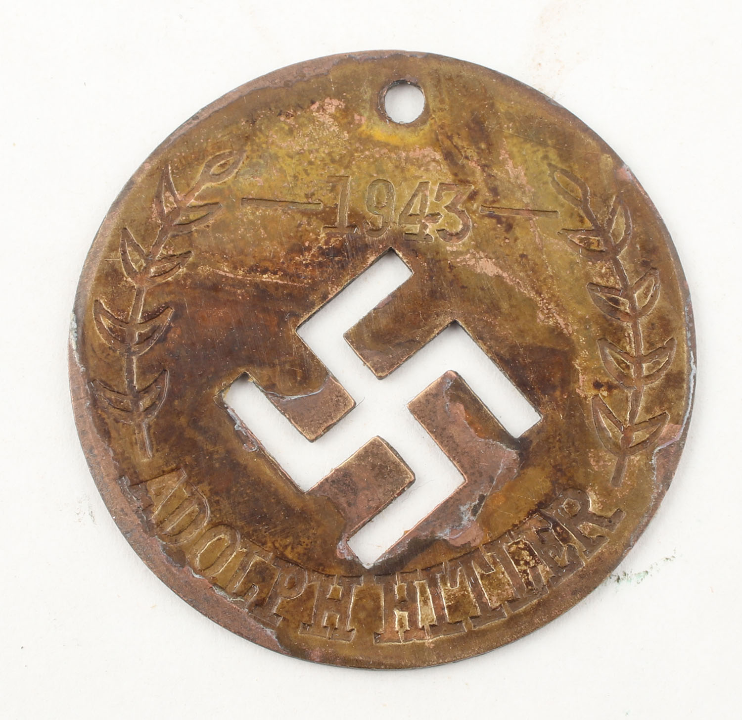 Rare large Adolph Hitler token with cut out swastika, dated 1943. Grade: Excellent - Value: 40 to 100