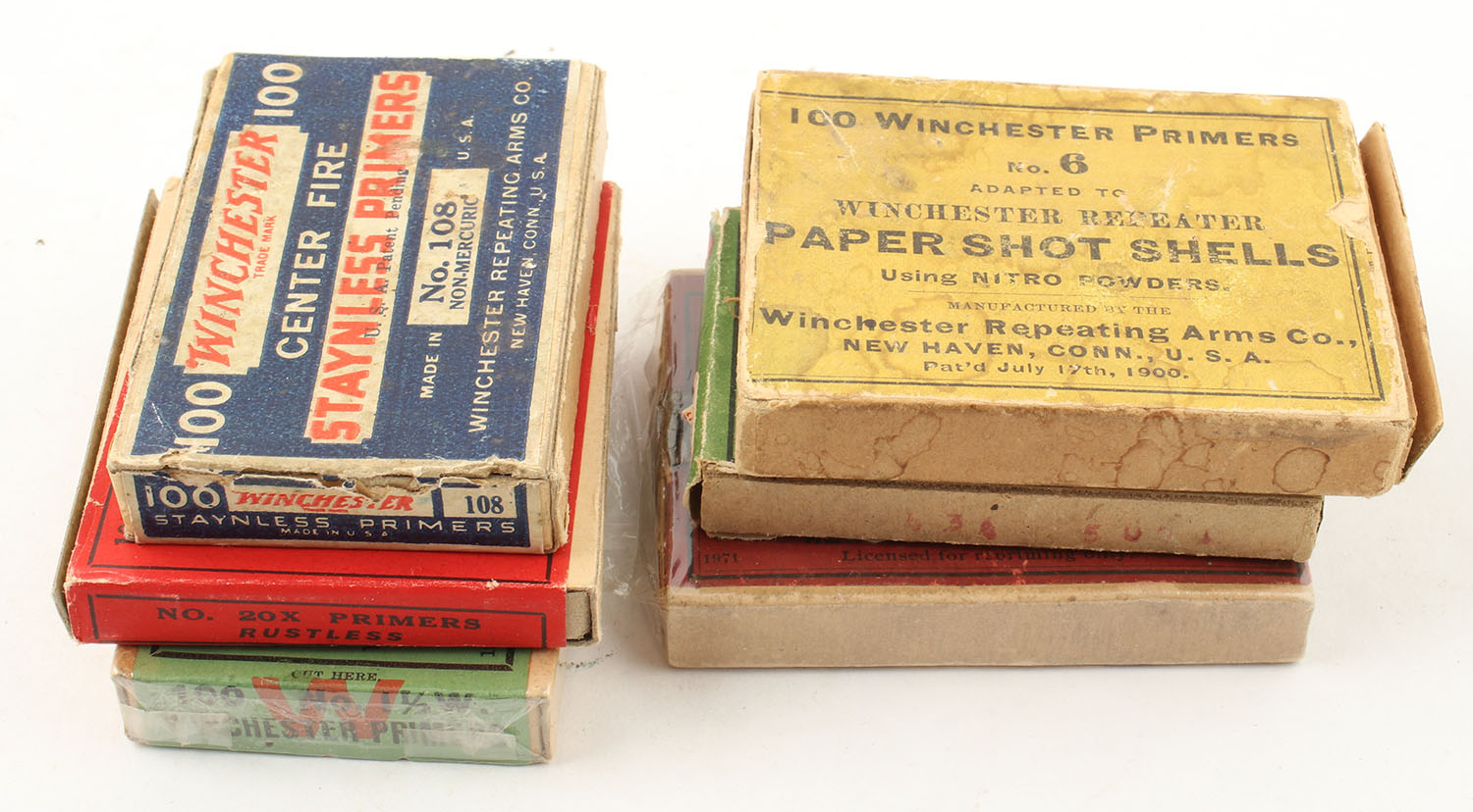 Lot of 6 primer boxes, all partial, Winchester, Rem Umc and Peters. Grade: Very Good ++ - Value: 10 to 50