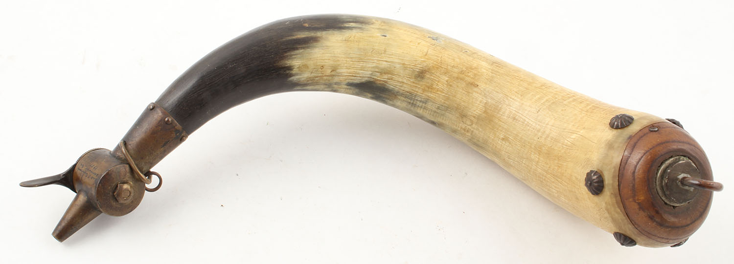 RARE! Mark B Burnham powder horn, dated 1957 L525, Empty. Grade: Excellent - Value: 30 to 60