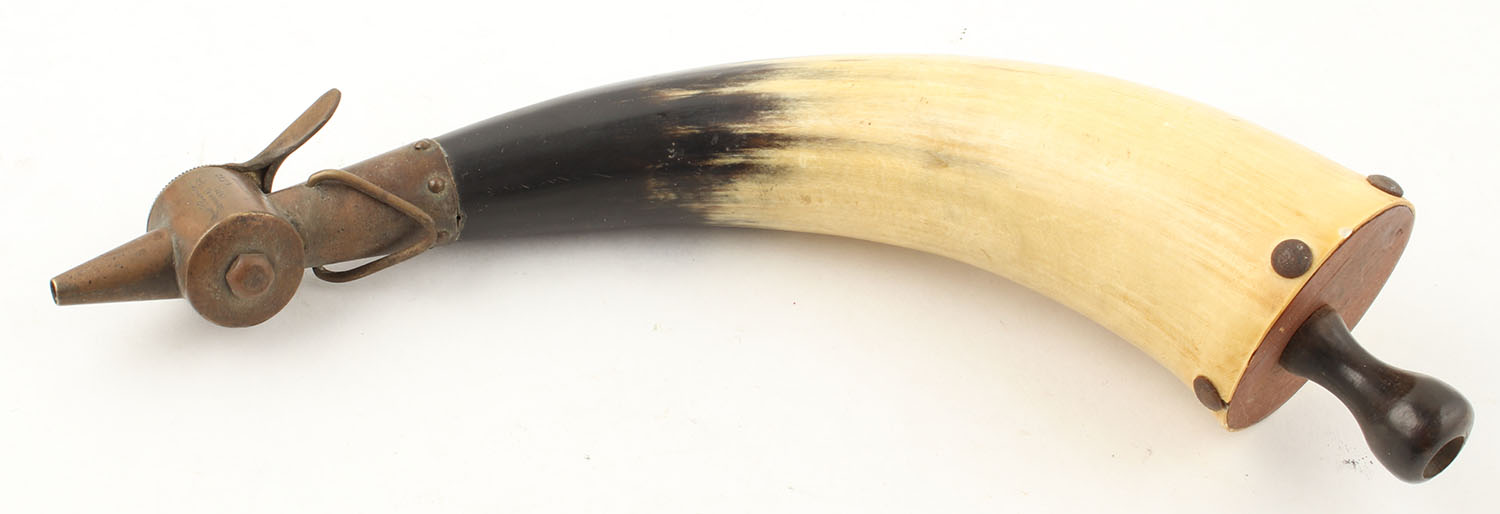 RARE! Mark B Burnham powder horn, dated 1958 L581, Empty. Grade: Excellent - Value: 30 to 60