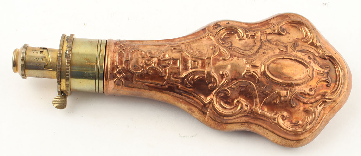 Sykes Patent Antique Brass powder flask, double side flask with beautiful design. Grade: Excellent ++ - Value: 100 to 200