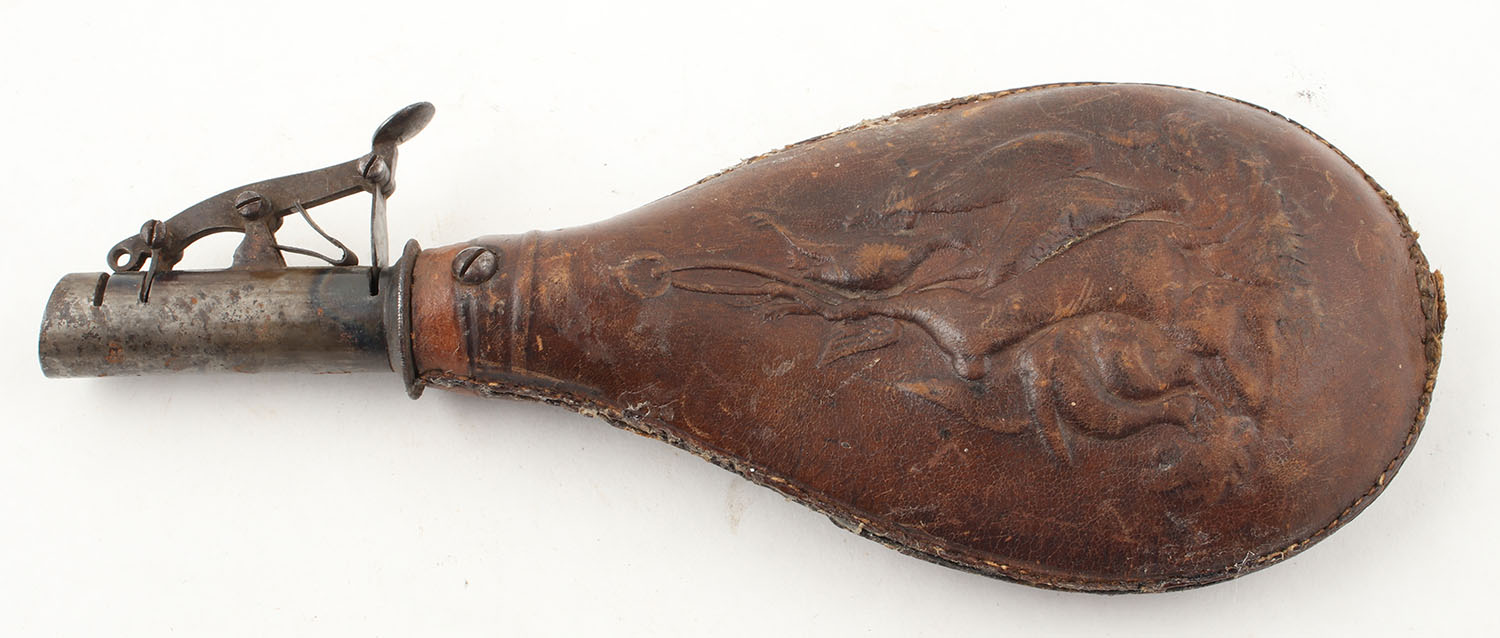 Unmarked leather powder flask, double side flask with design, has scuffing. Grade: Very Good ++ - Value: 20 to 60