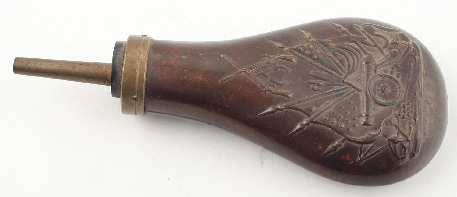 Antique Brass powder flask, single sided, empty. Grade: Excellent - Value: 16 to 60