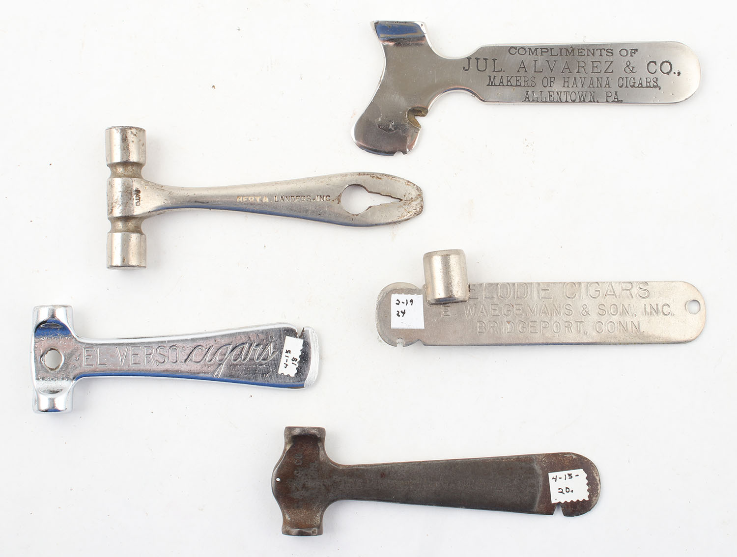 Lot of Small hammers from different cigar/tobacco companies for opening tins. Grade: Excellent - Value: 4 to 40