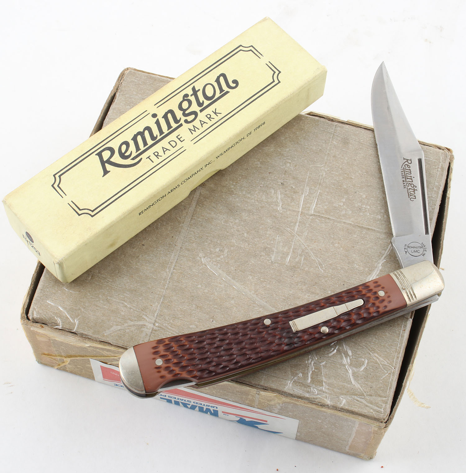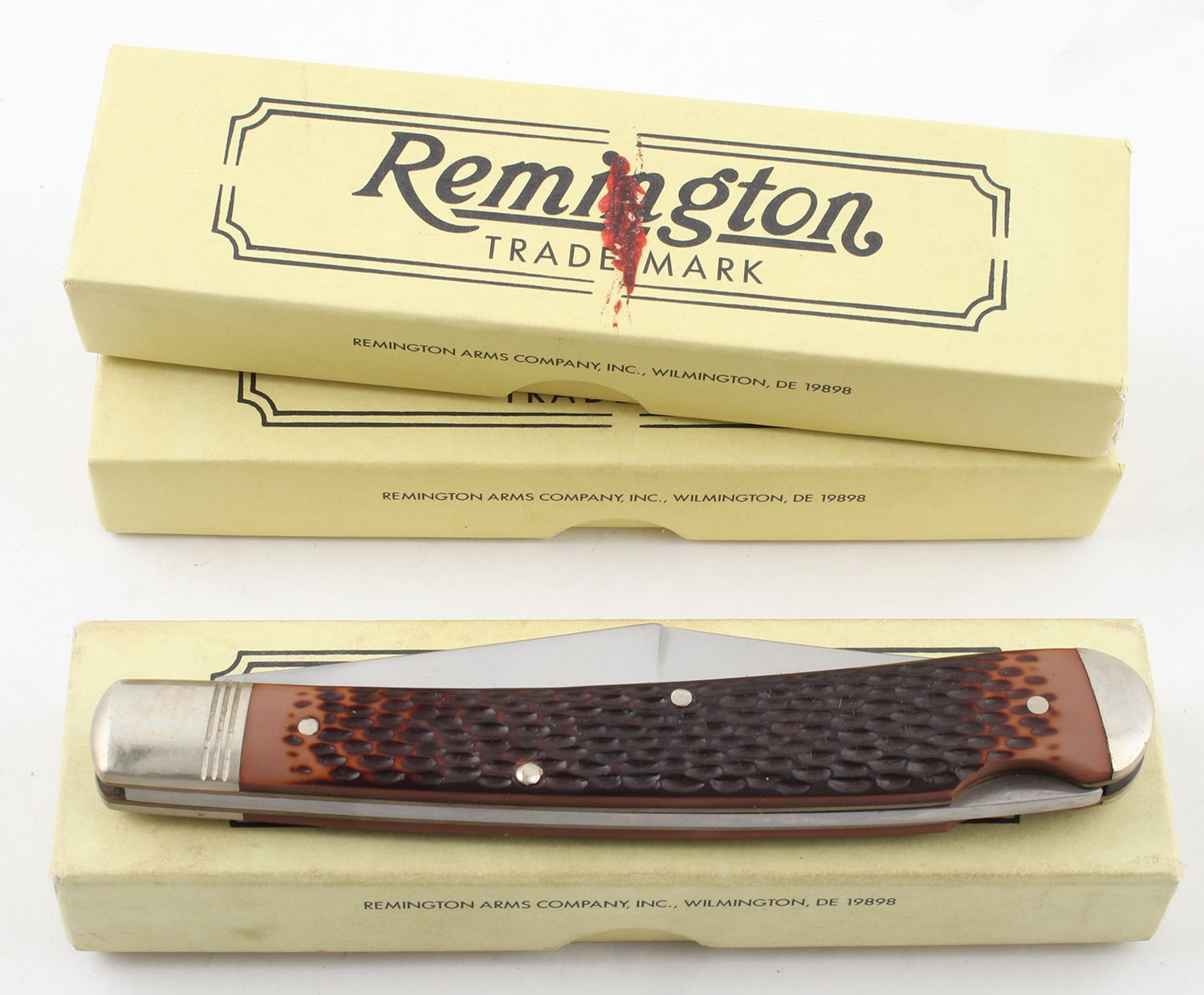 Case of 3 1992 Remington bullet knives, one R-1253, 1 blade folding knife, in original box. Grade: Excellent + - Value: 100 to 200