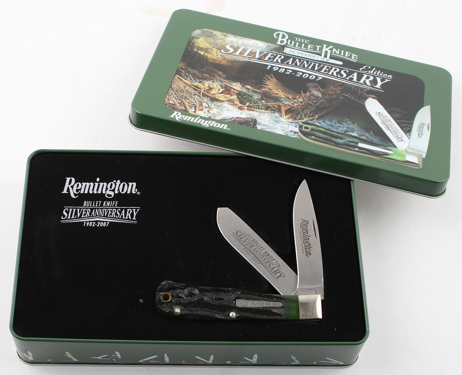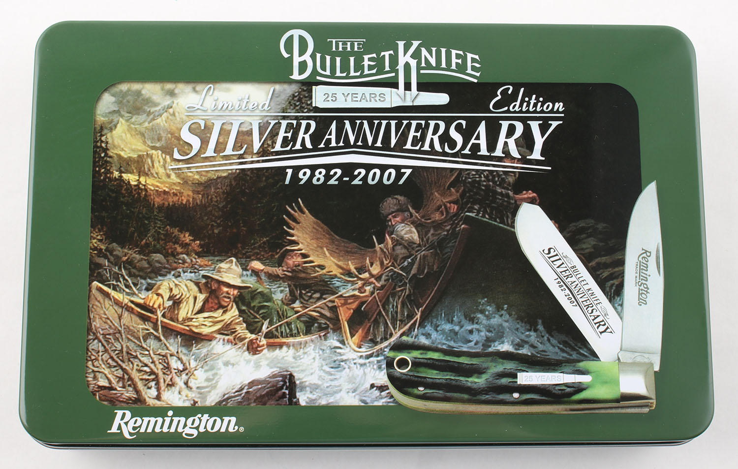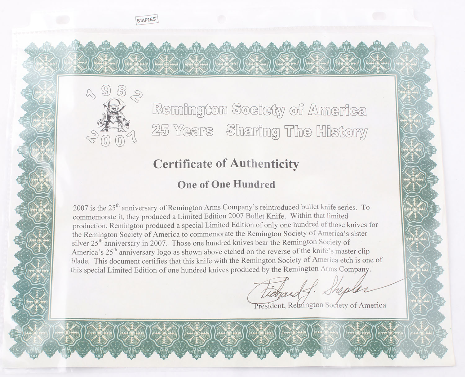 Remington bullet KNIFE, Silver Anniversary LE 1982-2007, has Certificate of Authenticity, sealed in original box. Grade: Excellent ++ - Value: 50 to 200