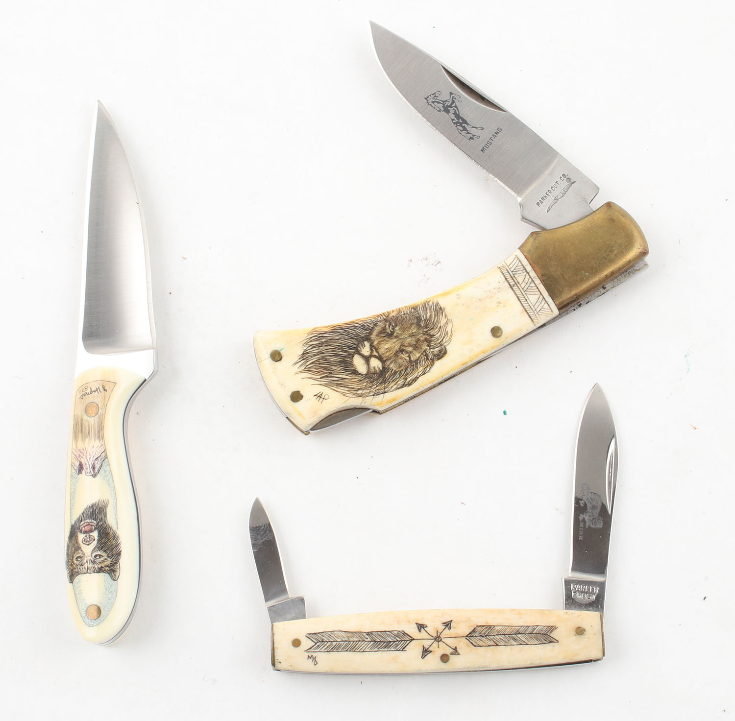 Lot of 3 Scrimshaw on bone knives, 2 folding and 1 fixed. Grade: Excellent ++ - Value: 50 to 100