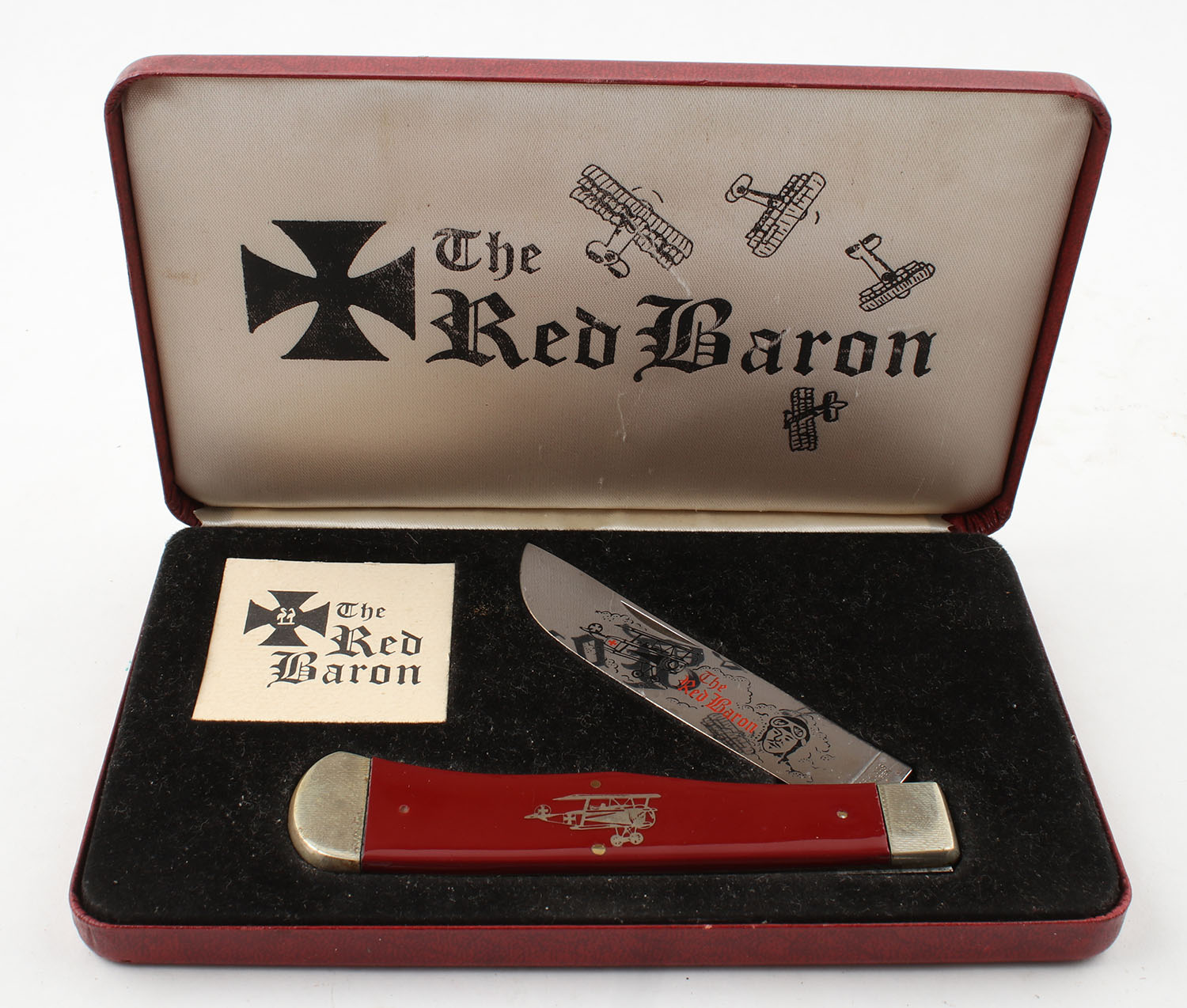 Kissing Crane The Red Baron folding blade knife, in original case, 3.75'' blade, all bright and clean. Grade: Excellent ++ - Value: 50 to 100
