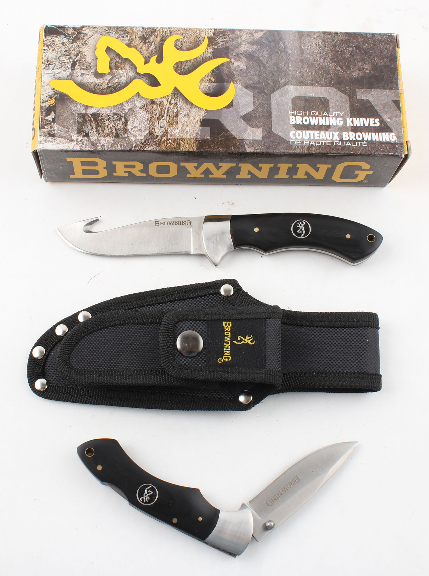 Browning set of knives, folding and fixed blade, in sheath and original box, all bright and clean. Grade: Excellent ++ - Value: 30 to 90
