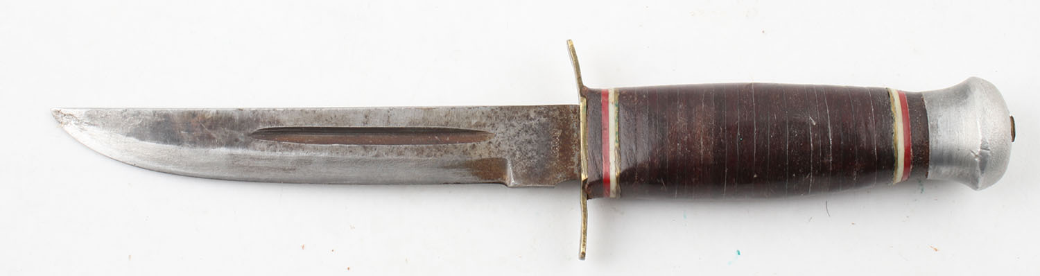 Antique hunting knife heavy brass hilt leather spacers with red and white end spacers on handle 8 3/8'' OAL. Grade: Very Good ++ - Value: 30 to 150