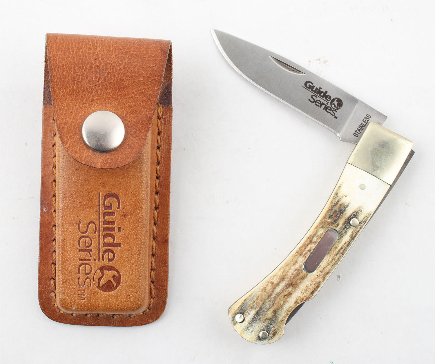 Vintage new old stock guide series bone handle skinning knife brass hilt with sheath, 6.75 OAL. Grade: Very Good ++ - Value: 16 to 50