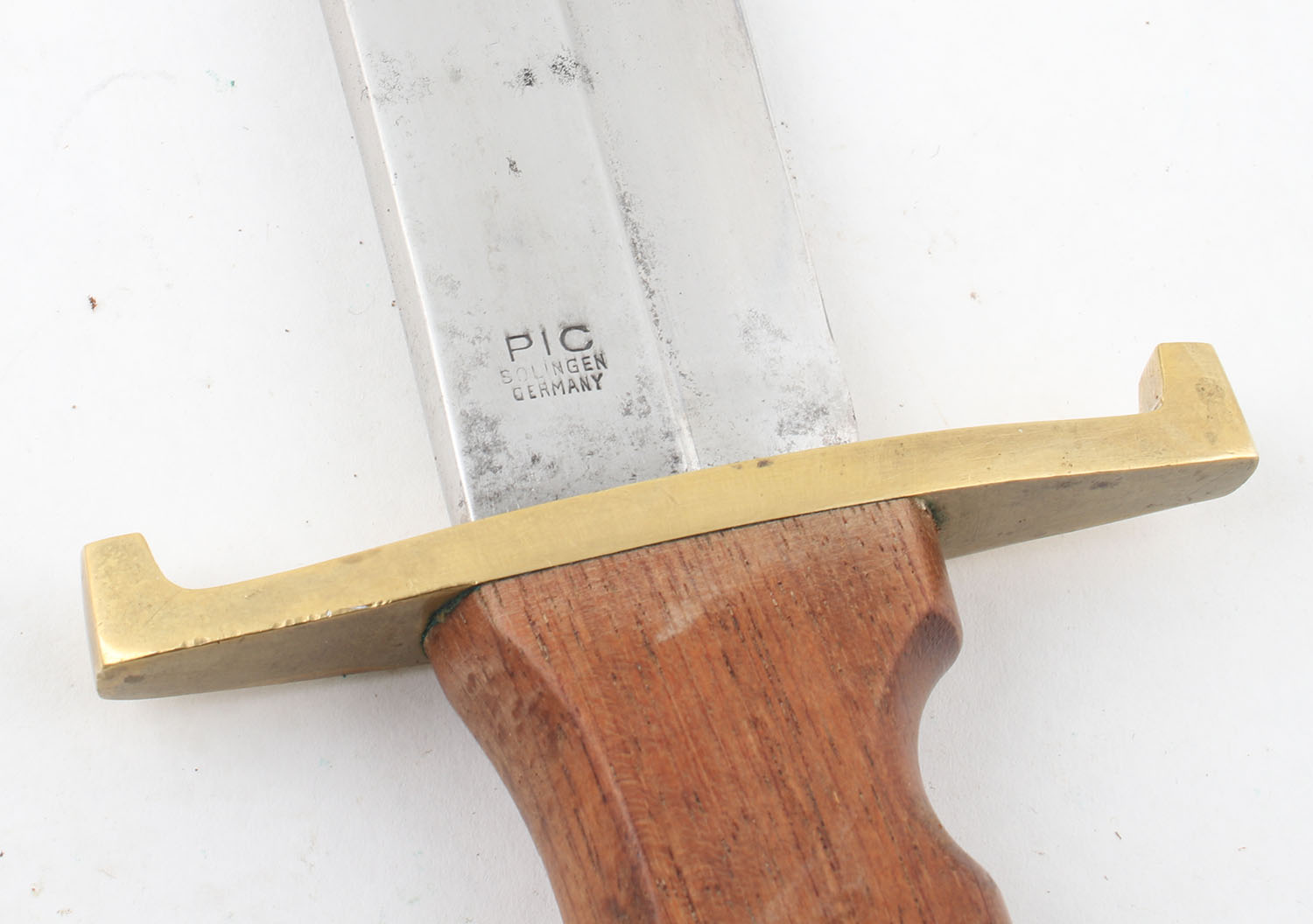 Large Bowie knife, fixed 8'' blade marked African Hunter, wood handle, leather sheath, handmade hammer forged. Grade: Excellent - Value: 50 to 150