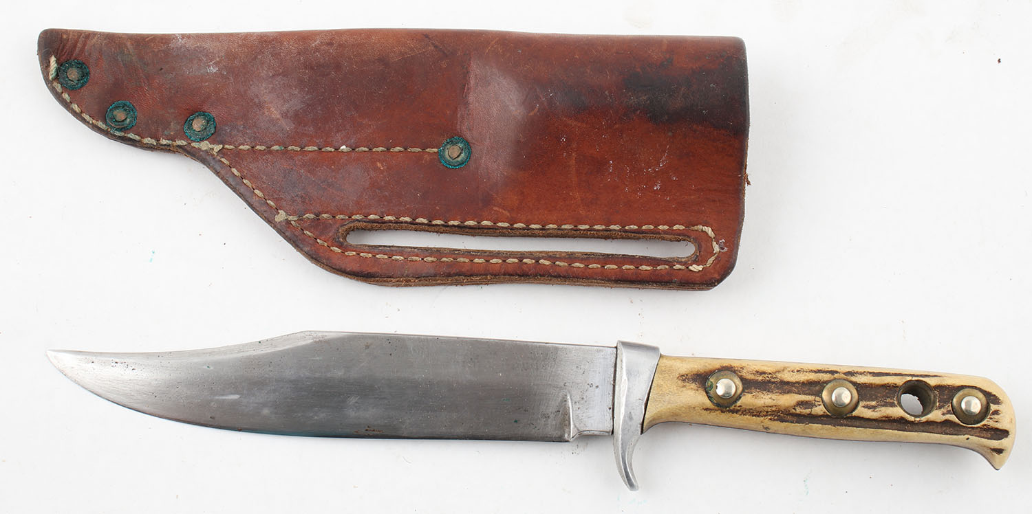 PUMA? Bowie knife, very hard to read, fixed 6'' blade, leather sheath, has wear to blade. Grade: Very Good + - Value: 50 to 150
