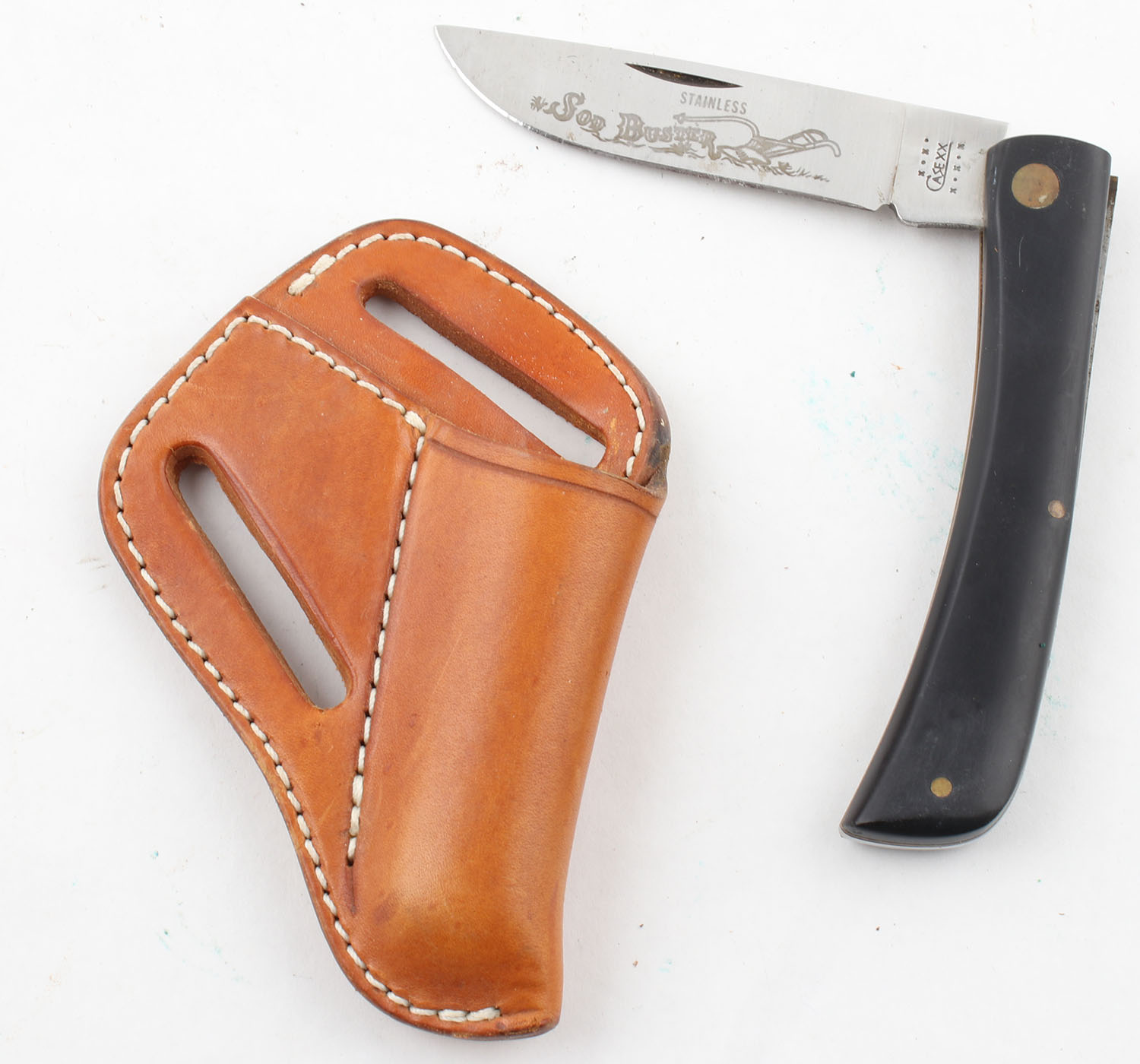 Case knife, sod buster folding 3'' blade, 2138 SS, has sheath, has age soiling. Grade: Very Good ++ - Value: 30 to 90