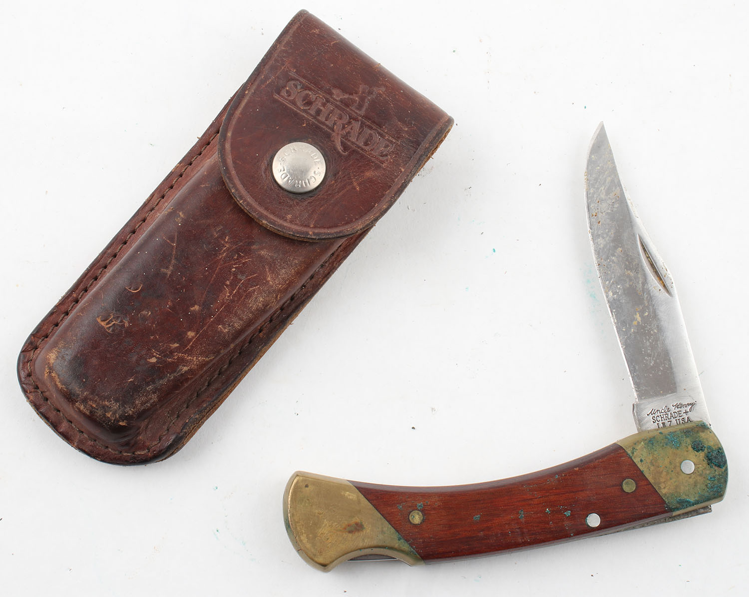 Schrade Uncle Henry knife, folding 3'' blade, has sheath, has age soiling. Grade: Very Good - Value: 20 to 80
